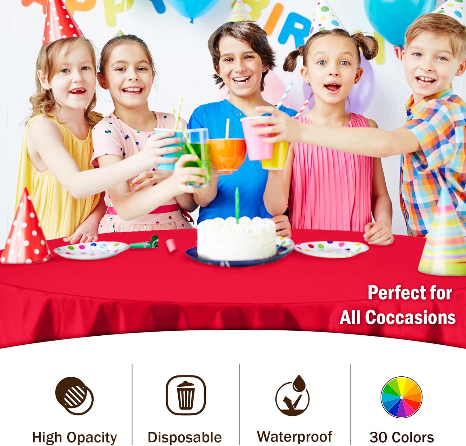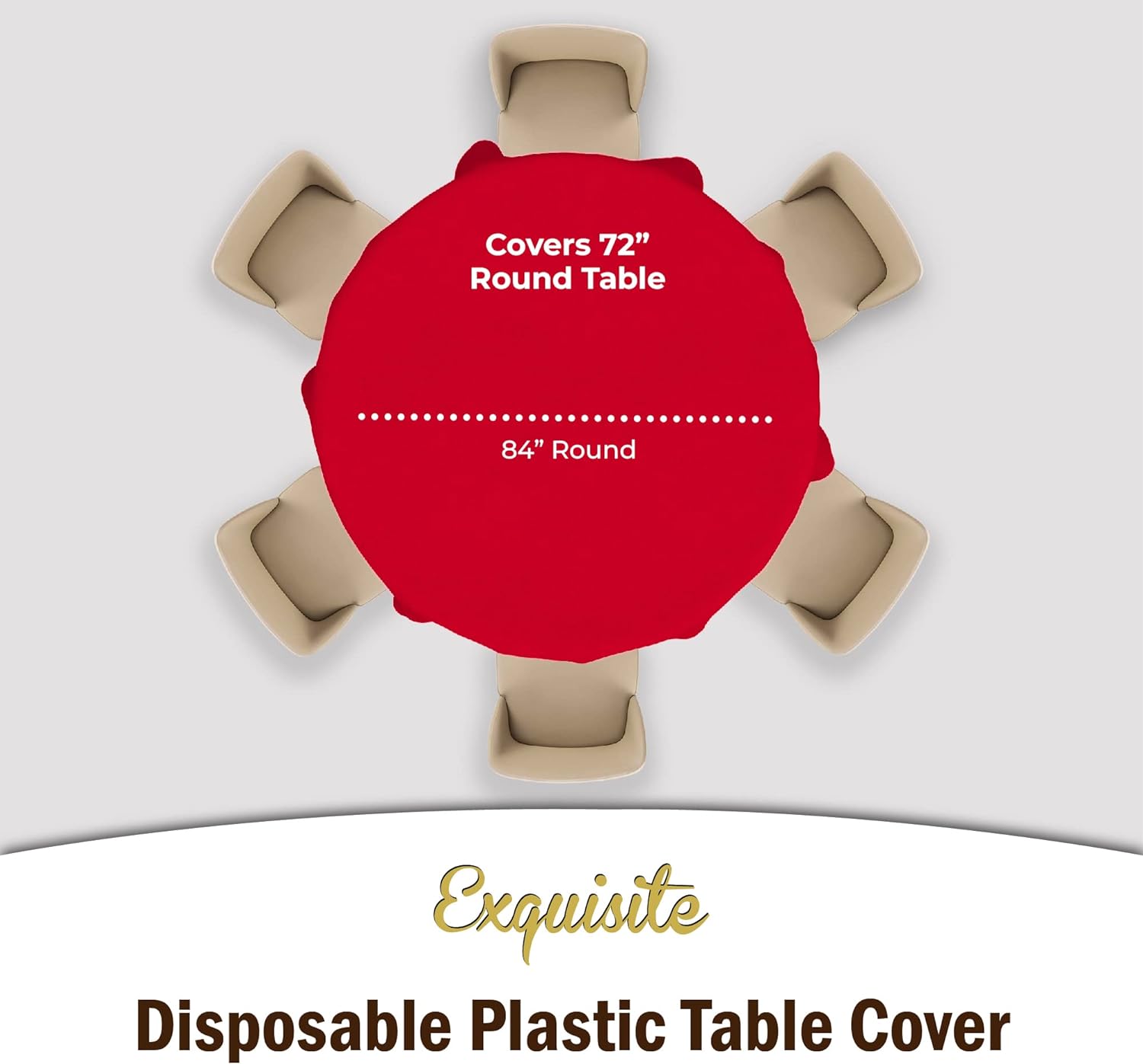 - PREMIUM QUALITY PROTECTION: This 12 pack of 84 in. Red Round plastic tablecloths will cover any table up to 7 feet. Unlike your typical paper table clothes these disposable table covers for parties are spill and waterproof!!!