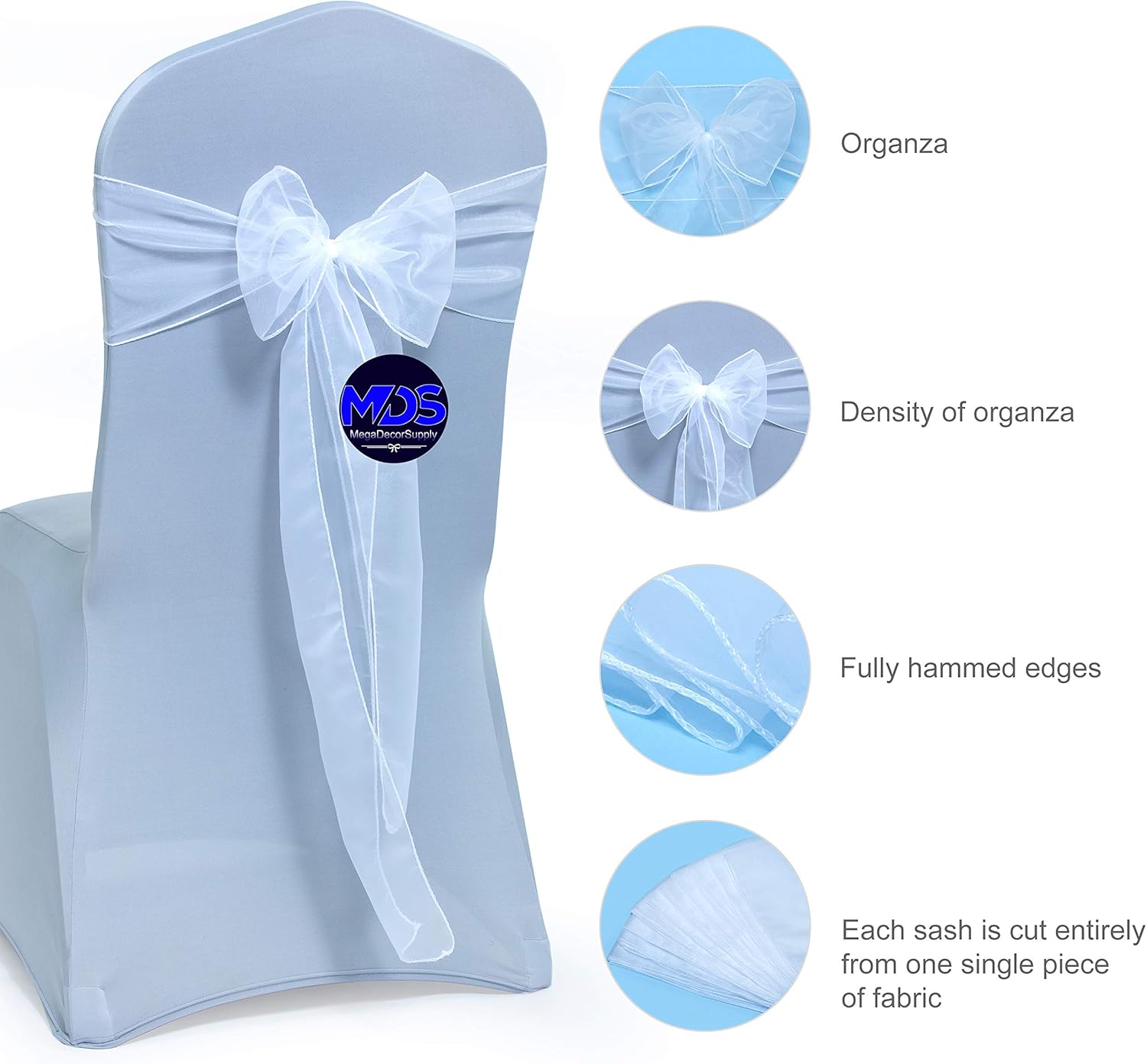 - The 7" x 108" organza sash is cut entirely from one single piece of fabric, leaving plenty of length with tying the fabric into bows or other shapes based on your own style. It can be fits to any banquet chair, folding chair or Chiavari chairs.