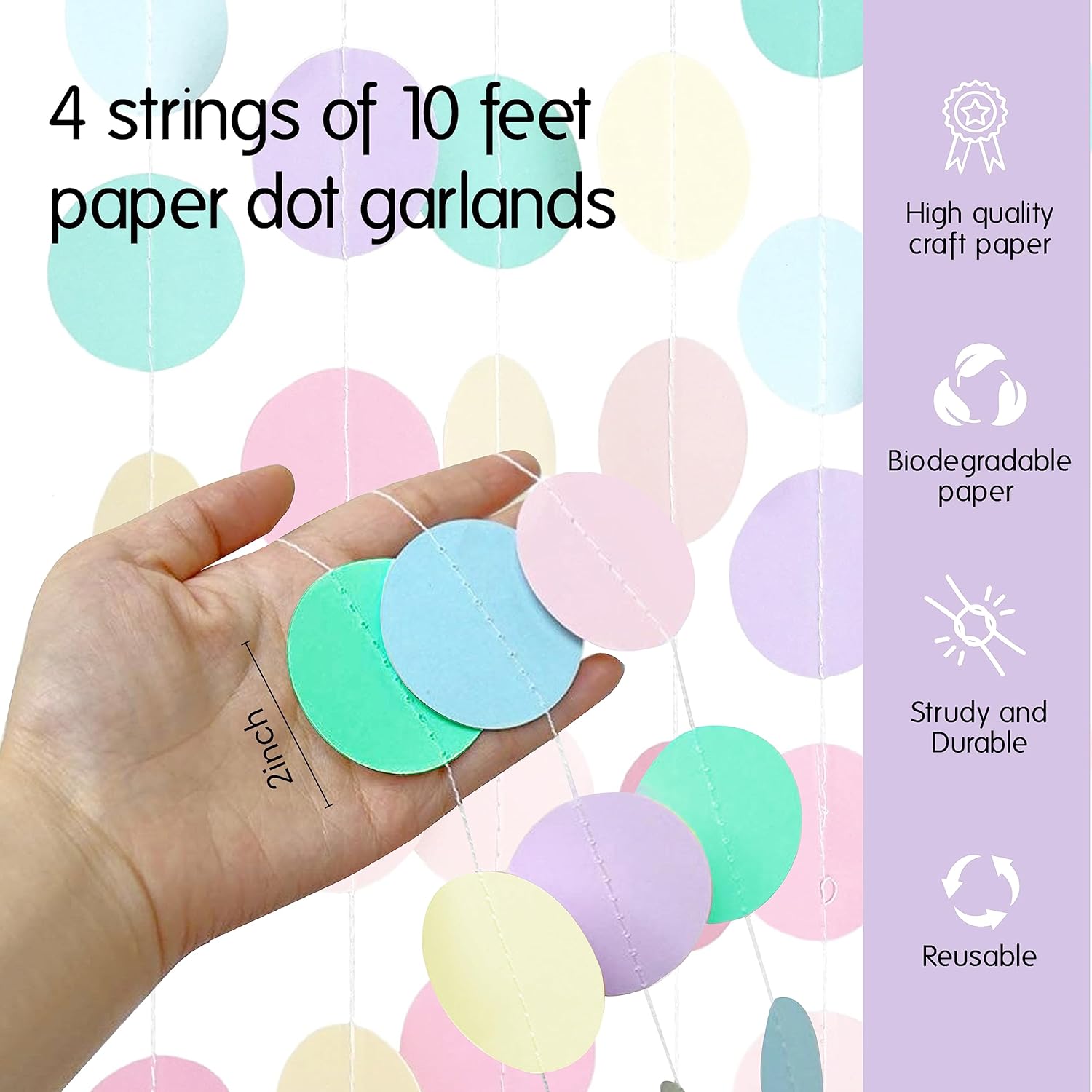 • METICULOUSLY HAND SEWN: Paper circle dots are hand sewn with each other at even intervals. Each circle dot measure approximately 2 inches in diameter- a versatile and universal size for all events!