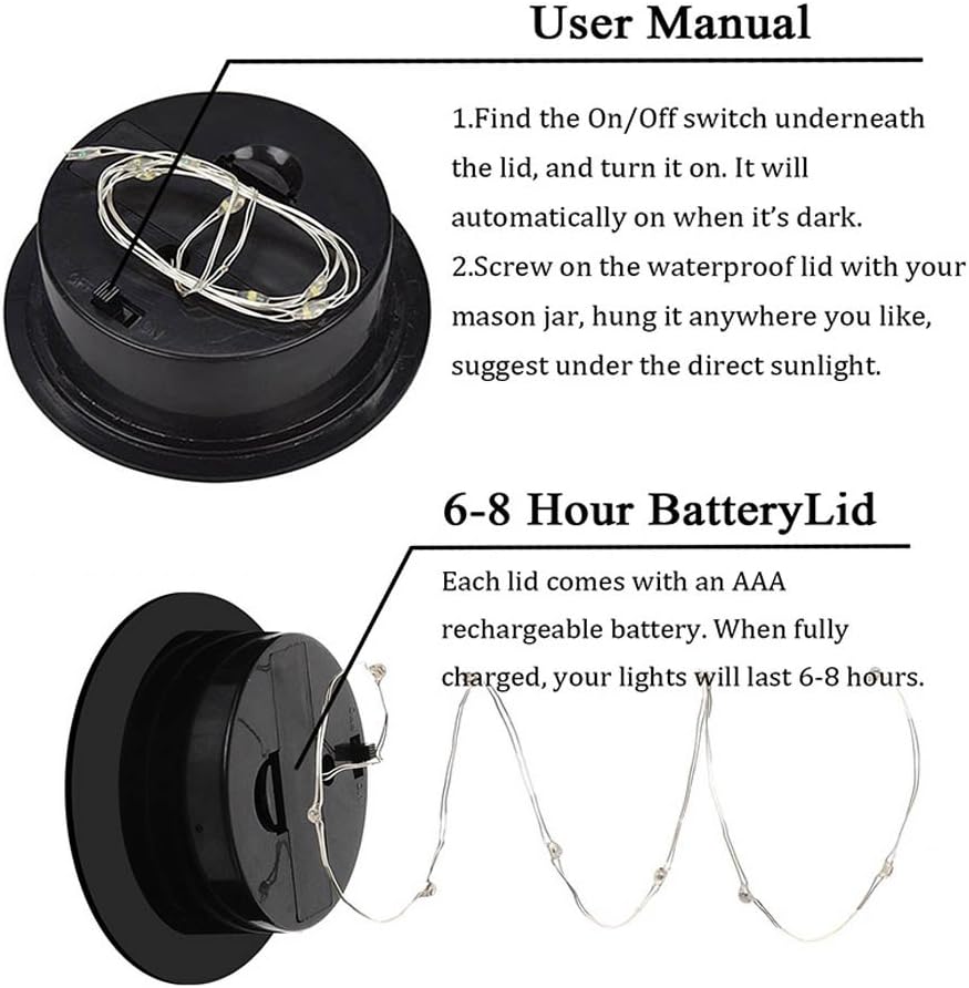 - Solar Powered Mason Jar Lid Lights. - Energy Saving & Environment Friendly. 100% solar powered solar panel, no requires external wiring. 1.2v/600mAH AAA rechargeable battery included. It need take 6-8 hours charging time by fine sun light, light up for about 8-12+hours.