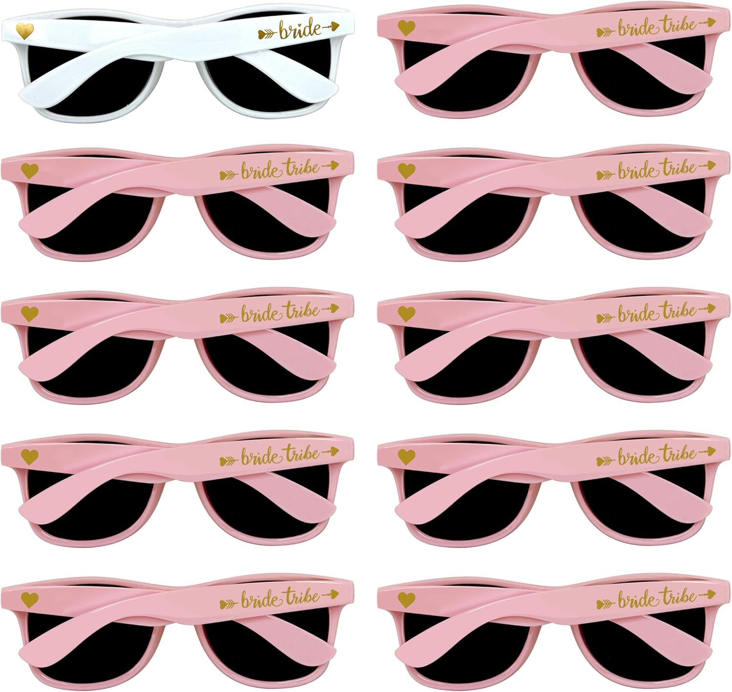 - Bachelorette Sunglasses Set---This Bachelorette Sunglasses kit contains a total of 1 Pair of white 'Bride' Sunglasses, 9 Pairs Pink 'Brides tribe' Sunglasses for bridesmaid. Great idea for Bachelorette party and bridal party.