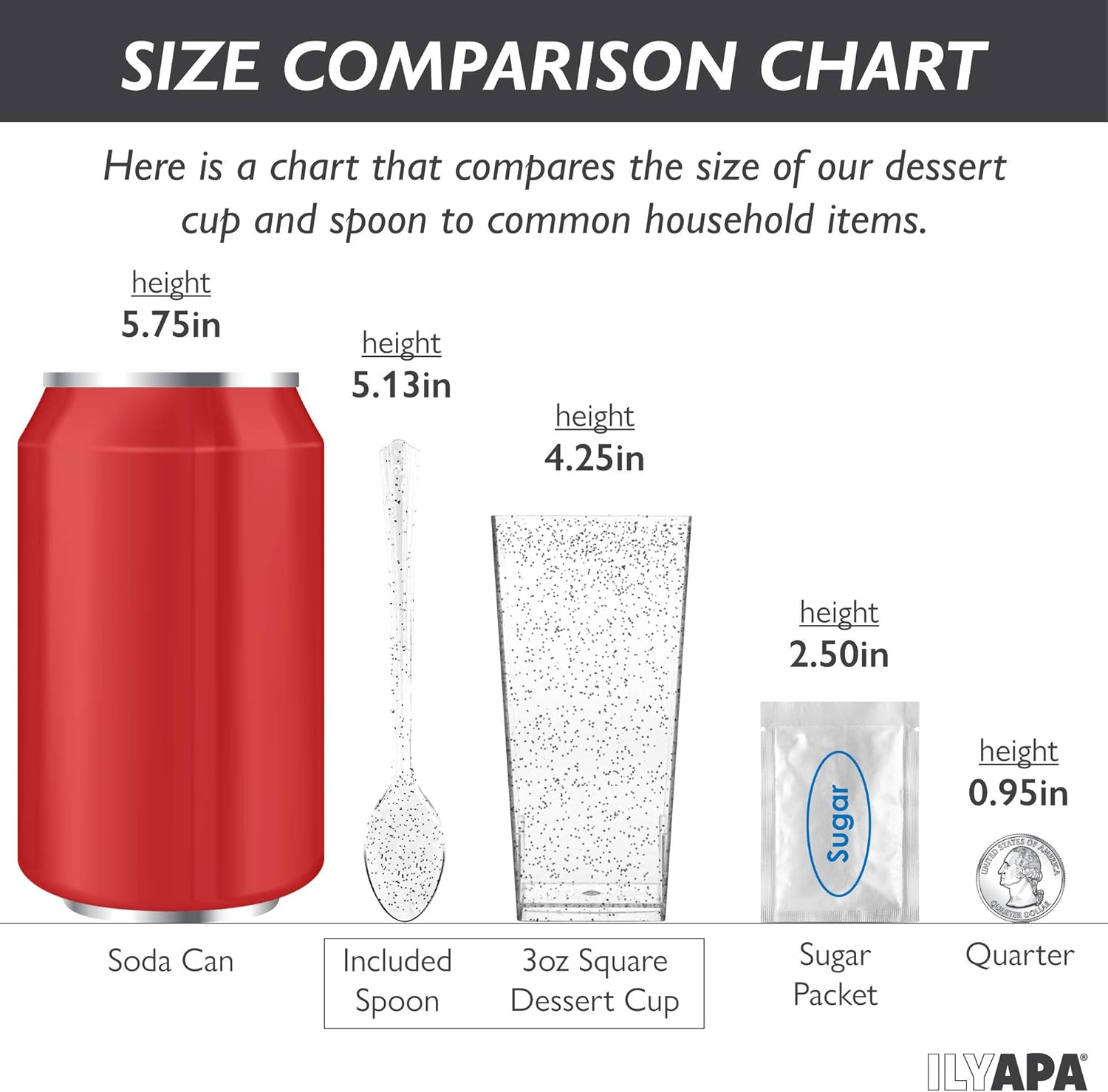 - Enhance any Occassion - With these stylish and premium dessert shooter cups! These 3oz square plastic serving cups come with 100 spoons, everything you need to serve 100 guests. These small desert cups are perfect for breakfast, brunch, appetizers, and more!