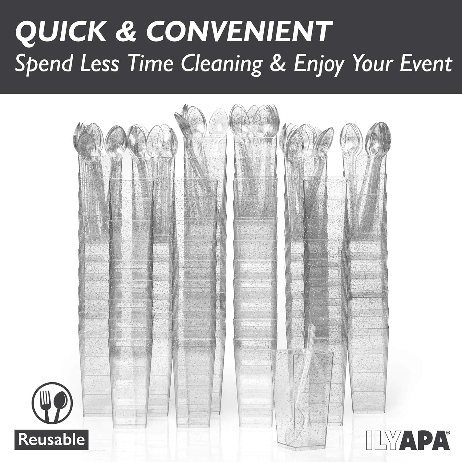 Ilyapa 3oz Plastic Dessert Cups - 100 Pack Mini Dessert Cups with Spoons - Clear Reusable Small Appetizer Cup for Cheesecake Shooters, Chocolate Mousse - Party and Catering Supplies - Square Silver