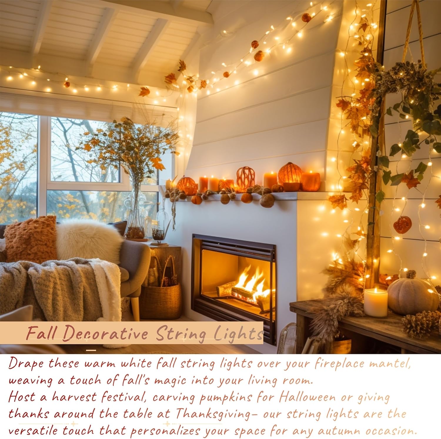 - Autumn Decor & Fall String Lights: Warm white string lights, with soft glow, can be used as part of fall decorations to create a cozy and warm atmosphere for celebrating the bountiful harvest season. The fall decor string lights are more than mere decorations. Whether you're hosting a Thanksgiving dinner, a Halloween party, or enjoy the season's changing colors, for wall、table、mantel、fireplace and window, warm white fall string lights are a versatile and elegant choice for fall decorations