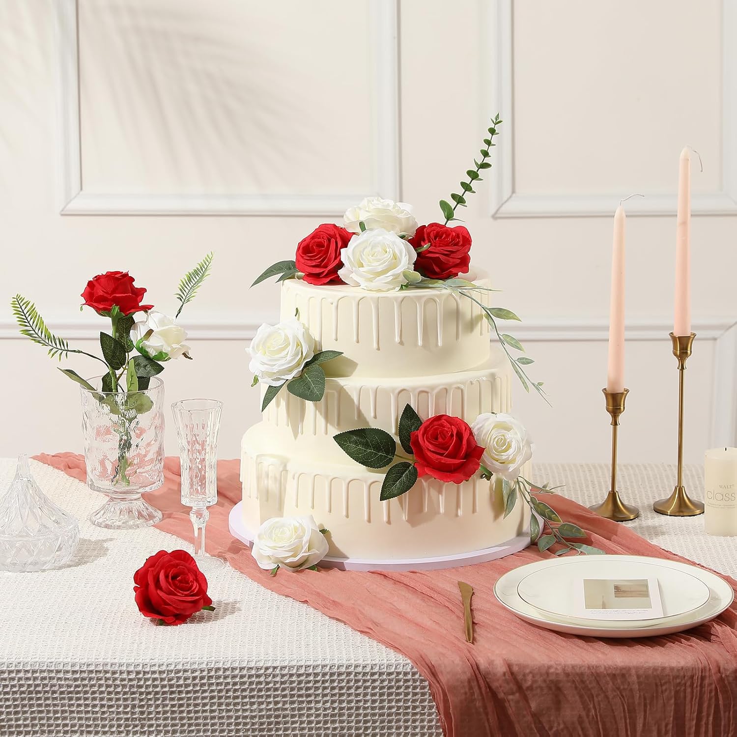 - Size: Each fake rose length is 1.64 ft/ 50 cm, flower 3.15 inch/ 8 cm in diameter, with realistic green leaves; Package: 1 Pack included 12 pcs artificial roses flowers in bulk