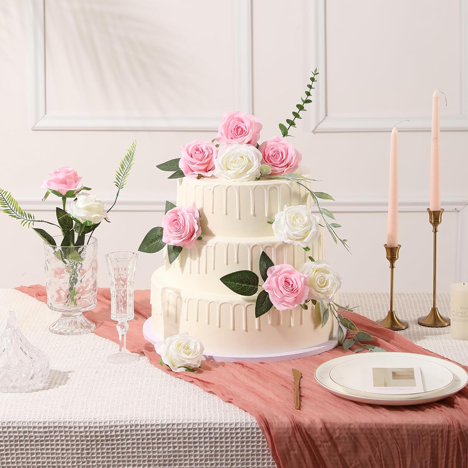 - Size: Each fake rose length is 1.64 ft/ 50 cm, flower 3.15 inch/ 8 cm in diameter, with realistic green leaves; Package: 1 Pack included 12 pcs artificial roses flowers in bulk
