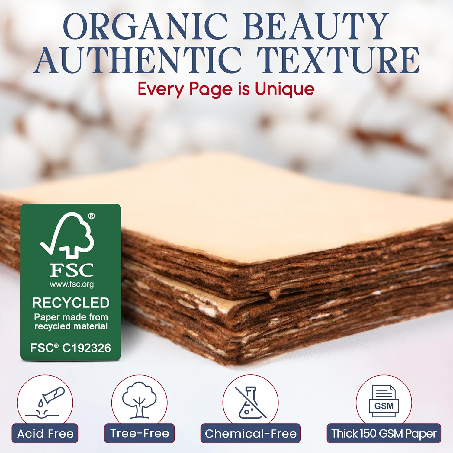 - Material : 100% recycled cotton rag fibers form the base of this eco-conscious handmade paper., 150 GSM cotton fiber paper, ideal for watercolor and fountain pen use., Artisans handcraft this paper from sun-dried cotton and natural fiber blends., Cotton-based paper with antique deckle edge crafted without chemicals or wood pulp., Crafted from acid-free cotton, ensuring durability and archival-quality preservation., Eco-friendly material includes cotton remnants upcycled from garment production., Hand-processed cotton pulp forms the foundation of this premium deckle edge paper., Handmade using raw cotton pulp, naturally dried under the sun., Made from long-fiber cotton for strength, texture, and minimal bleed-through., Natural cotton pulp is used to create a soft yet durable surface for writing and art., Natural materials like cotton and water combine in small-batch artisan production., Pure cotton base enhances ink absorption and supports multiple artistic media., Sustainably sourced cotton rags are transformed into thick, textured art paper., Tree-free cotton paper made from textile waste using traditional Indian methods. 100% recycled cotton rag fibers form the base of this eco-conscious handmade paper., 150 GSM cotton fiber paper, ideal for watercolor and founโฆ See more
