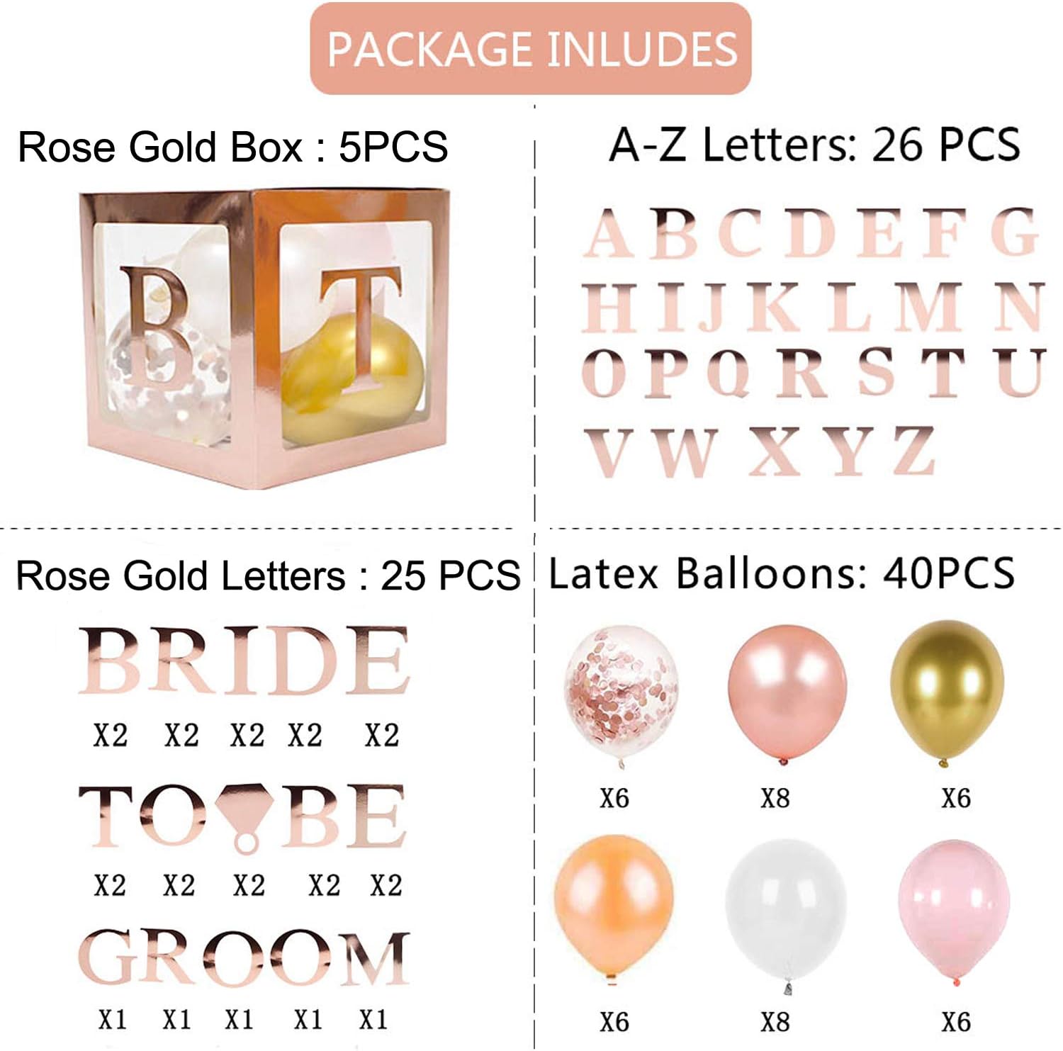 - 40 BALLOONS + 5 BOXES + 51 LETTERS: Why buy balloons separately when you can get everything in one easy-to-use kit? Other bachelorette party decorations only come with a few boxes and leave it up to you to supply the rest. Our gorgeous set comes with five transparent boxes, 40 beautiful balloons in metallic gold, rose gold, champagne, pearl pink, confetti and white! YouÕll also get two sets of ÒBRIDEÓ letters, two sets of "TO __ BE" letters and a set of "GROOM" letters, and A- Z ALPHABET letters