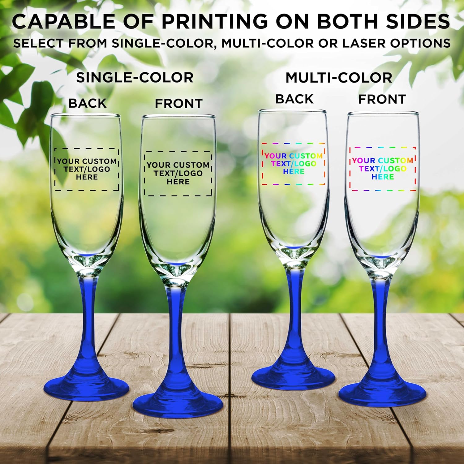 DISCOUNT PROMOS Custom Premiere Champagne Flutes 6.25 oz. Set of 100, Personalized Bulk Pack - Elegant Drinkware for Weddings, Events, & Promotional Gifts - Blue