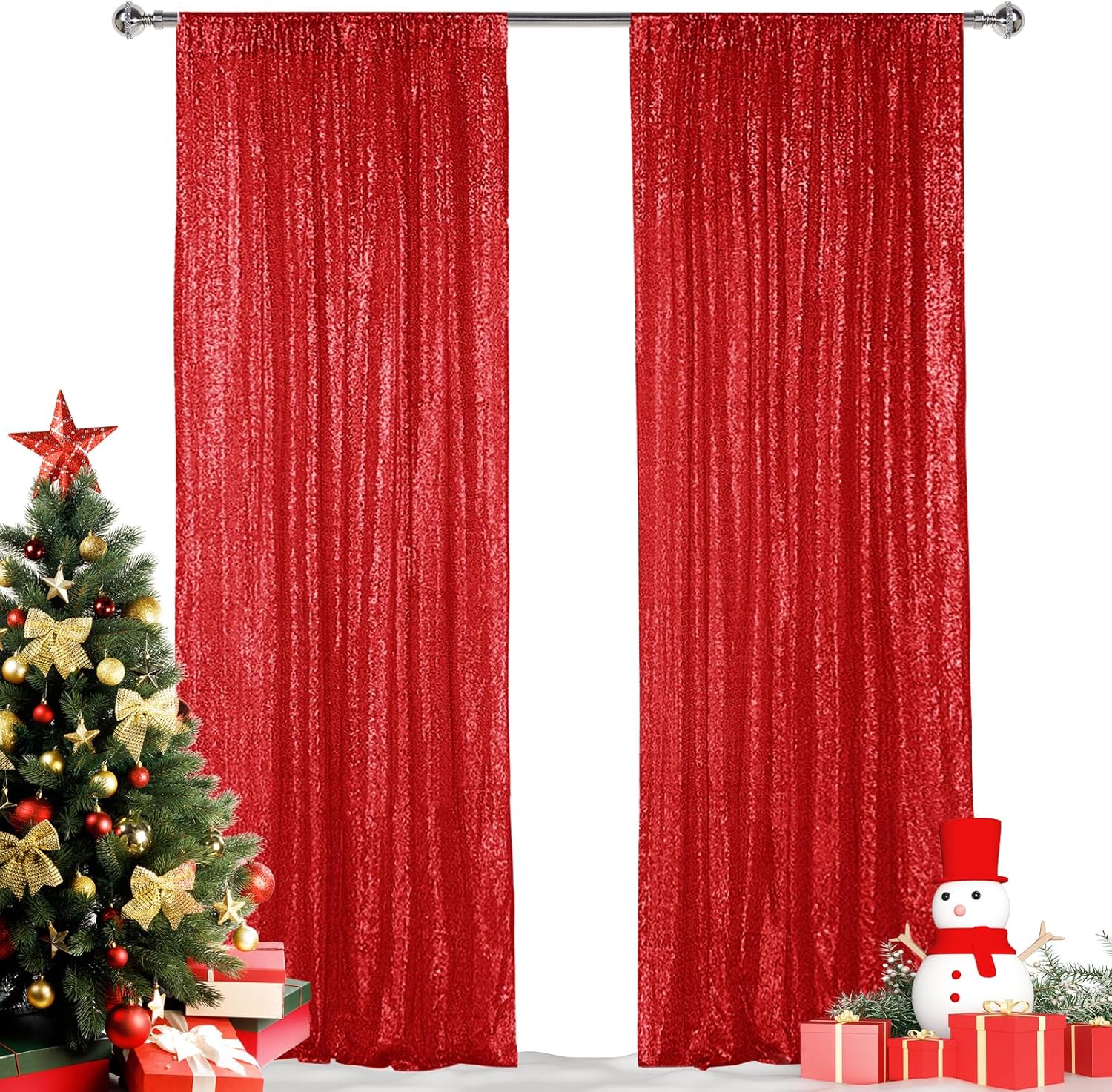 Hahuho Red Sequin Backdrop Curtain, 2PCS 2FTx8FT Glitter Backdrop Curtain for Parties, Christmas, Wedding, Party Decoration(2 Panels, 2FT x 8FT, Red
