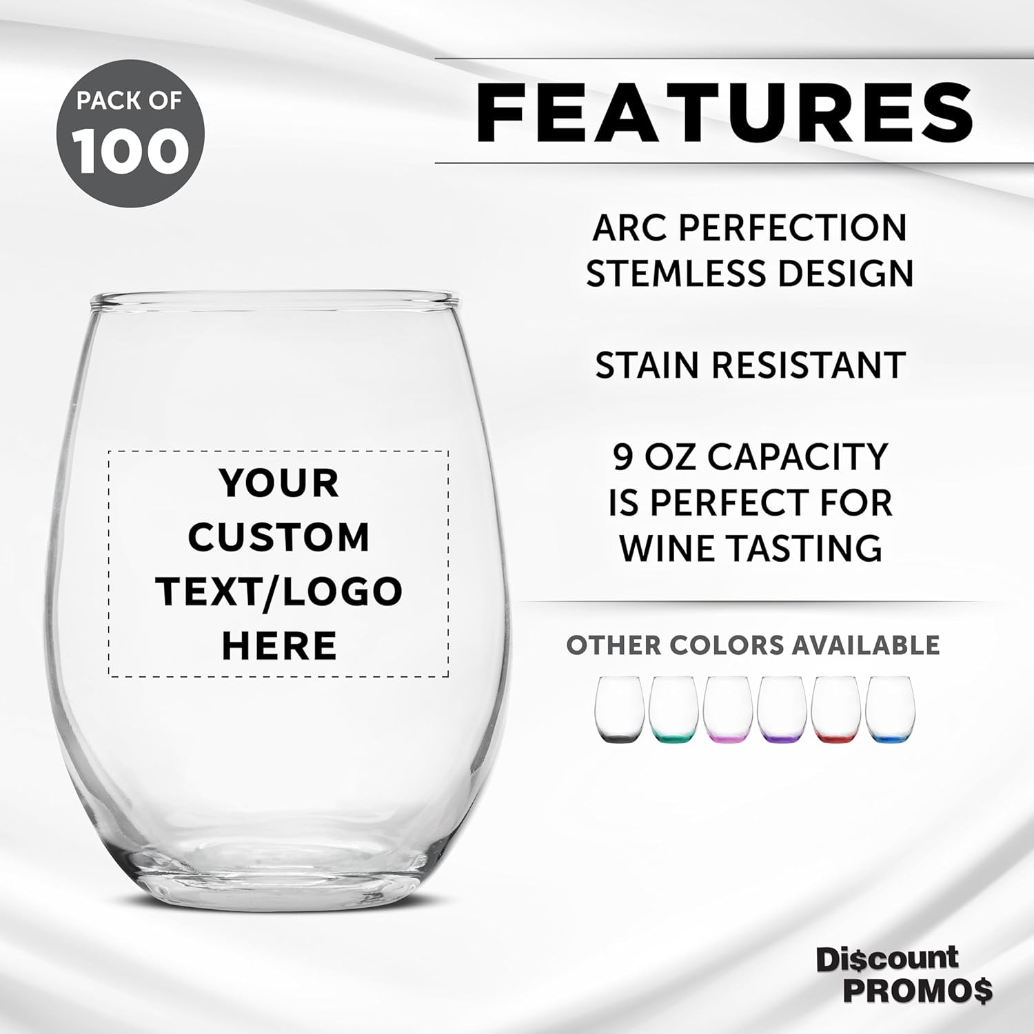 Custom Stemless Wine Glass 9 oz. Set of 100, Personalized Bulk Pack - Great for Wedding Favors, Bachelorette Party Decorations, Party Favors, Color Bottom - Clear