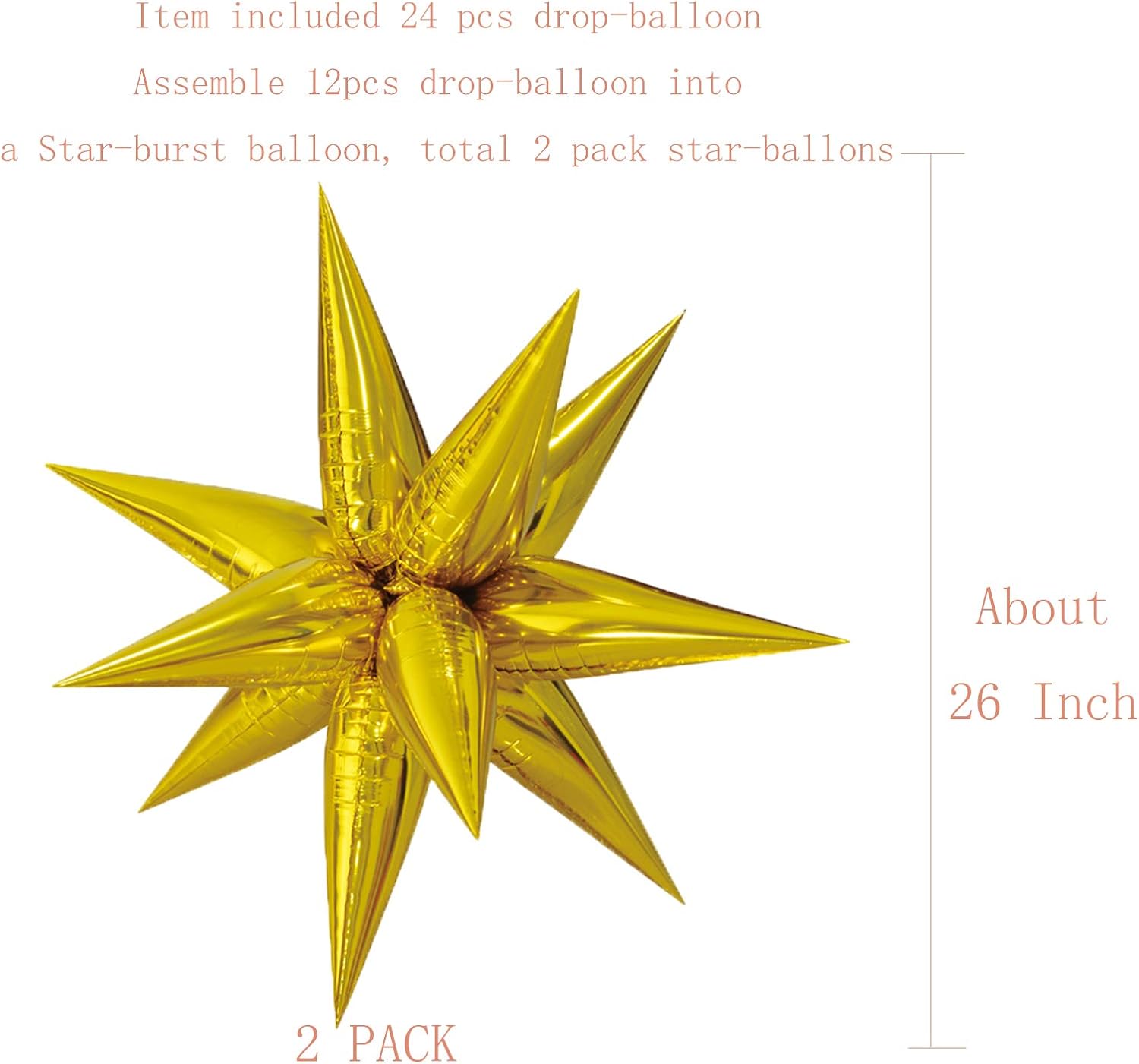 - Star Balloons, Item included 24 pcs drop-balloon, assemble 12pcs drop-balloon into a Star-burst balloon, total 2pcs Star-burst balloon