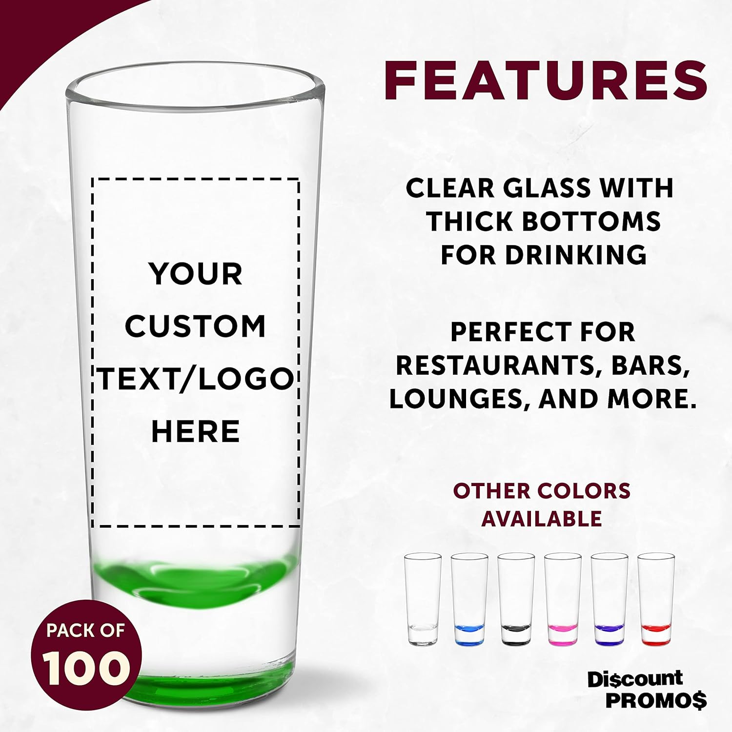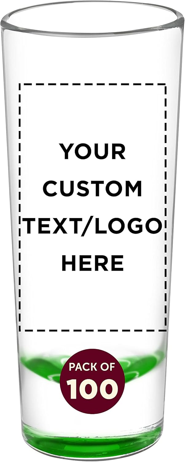 Custom Cordial Shooter Shot Glasses 2 oz. Set of 100, Personalized Bulk Pack - Great for Birthdays, Parties, Indoor & Outdoor Events - Green