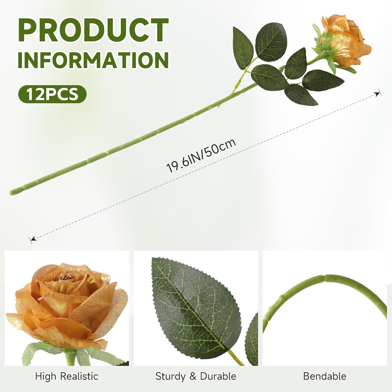 - Size: Each fake rose length is 1.64 ft/ 50 cm, flower 3.15 inch/ 8 cm in diameter, with realistic green leaves; Package: 1 Pack included 12 pcs artificial roses flowers in bulk