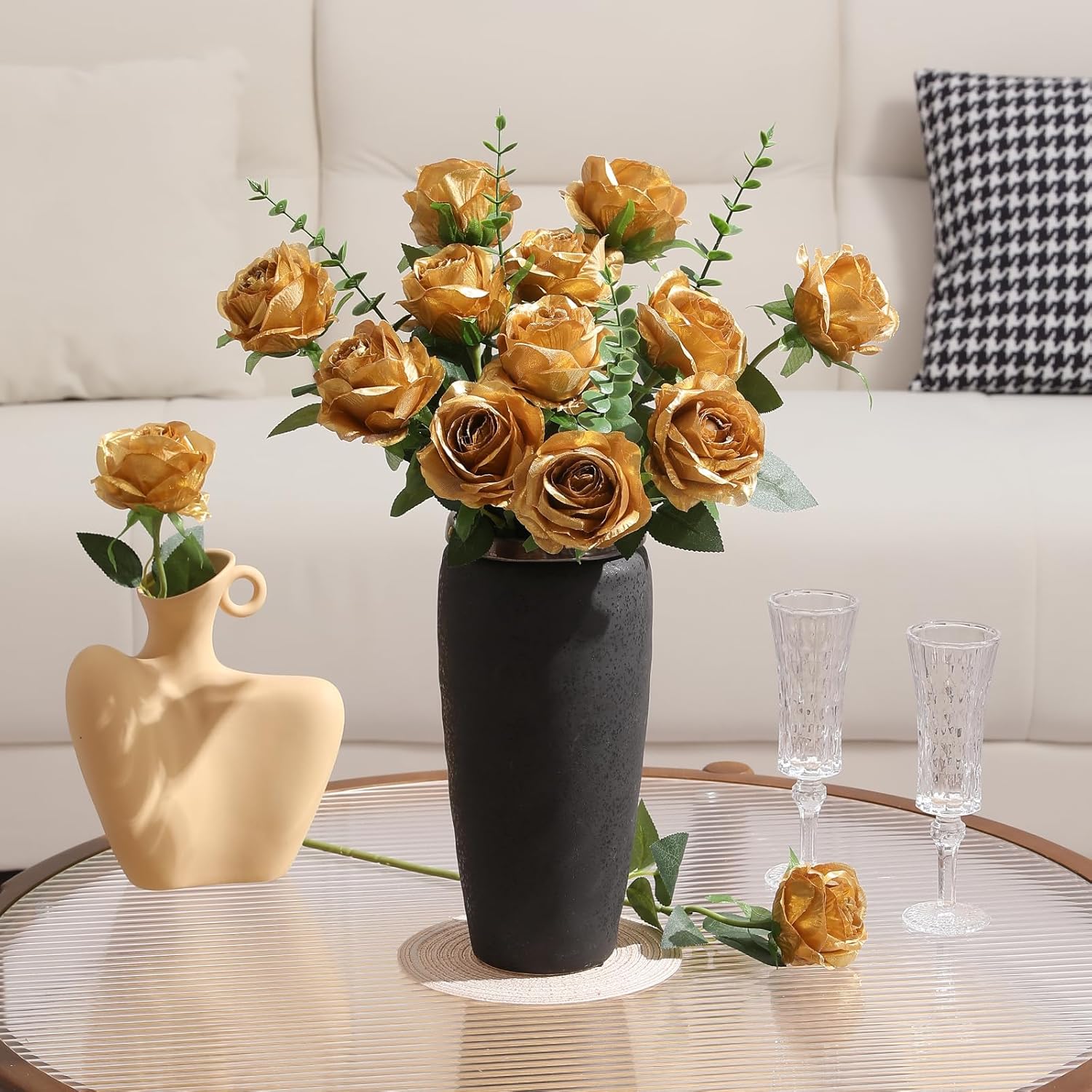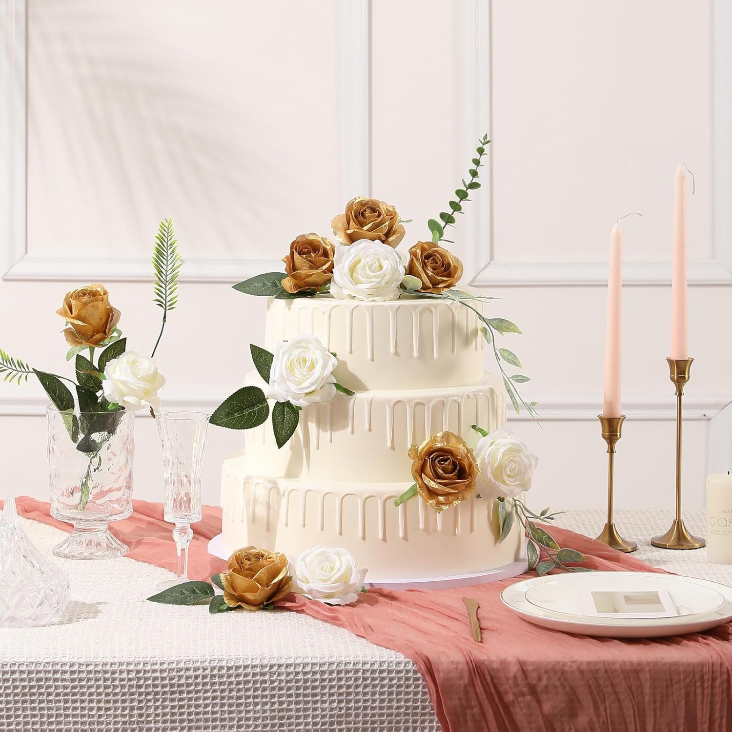 Tifuly Gold Roses Artificial Flowers -12Pcs Realistic Single Long Stem Fake Silk Roses Bouquet for Party Home Wedding Centerpiece Hotel Office Decor