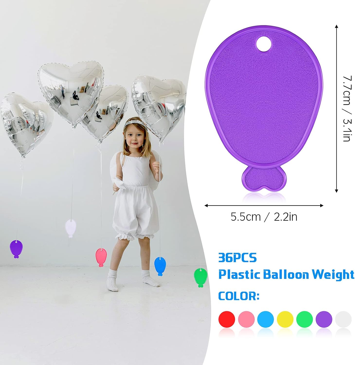 - Included Components : The package comes with 36 pieces of colorful plastic balloon weights in different colors. Each weight measures about 55 x 78 mm/ 2.2 3.1 inches and has a little hole on the top for tying balloons. colors include yellow, green, blue, white, red, purple, pink. The package comes with 36 pieces of colorful plastic balloon weights in different colors. Each weight measures about 55 x 78 mm/ 2.2 3.1 inchโฆ See more