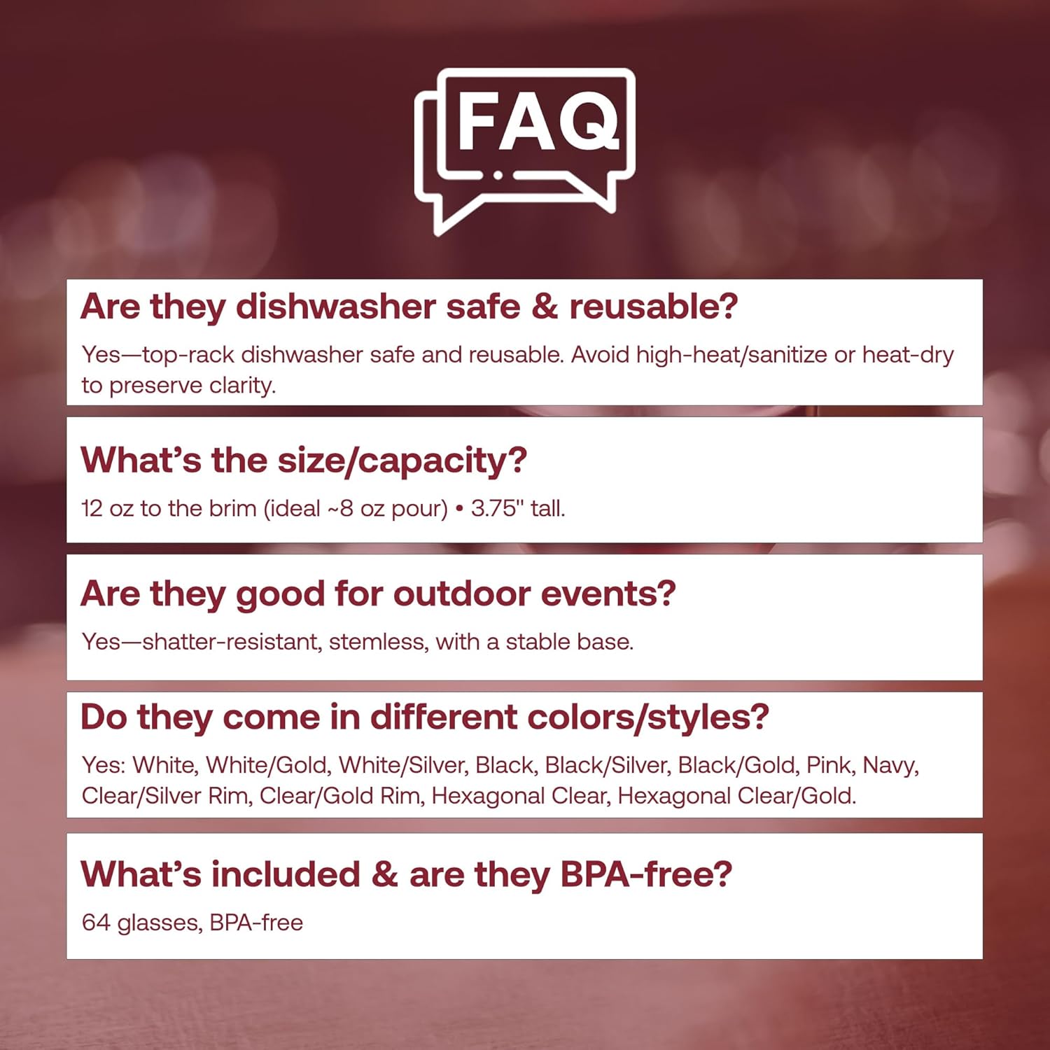 - BULK SET FOR LARGE GATHERINGS β This pack of 64 plastic stemless wine glasses provides ample drinkware for bigger events, ensuring every guest has a stylish glass to enjoy.