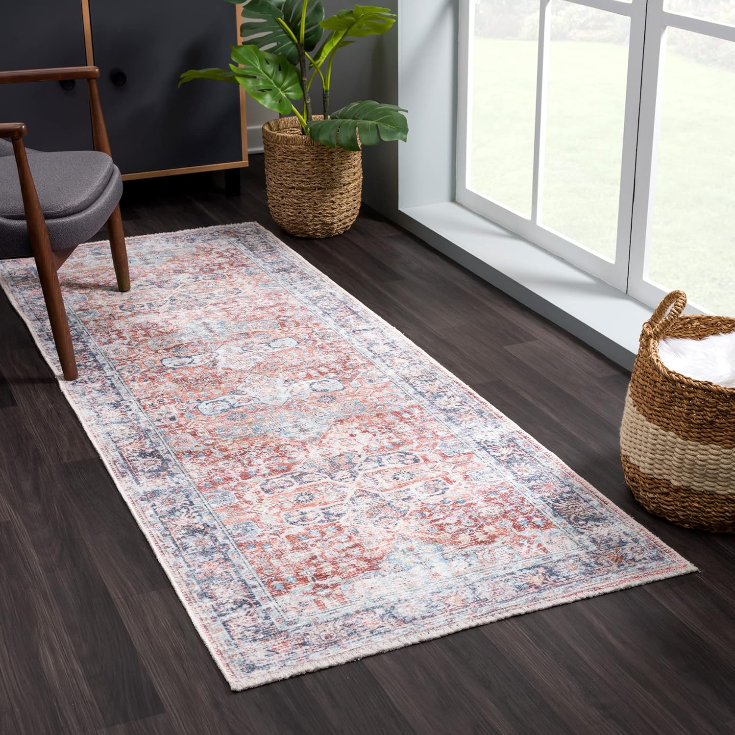 Bloom Rugs Caria Washable Non-Slip 7 ft Runner - Brick/Dark Blue Traditional Runner for Entryway, Hallway, Bathroom, and Kitchen - Exact Size: 2'6" x 7'