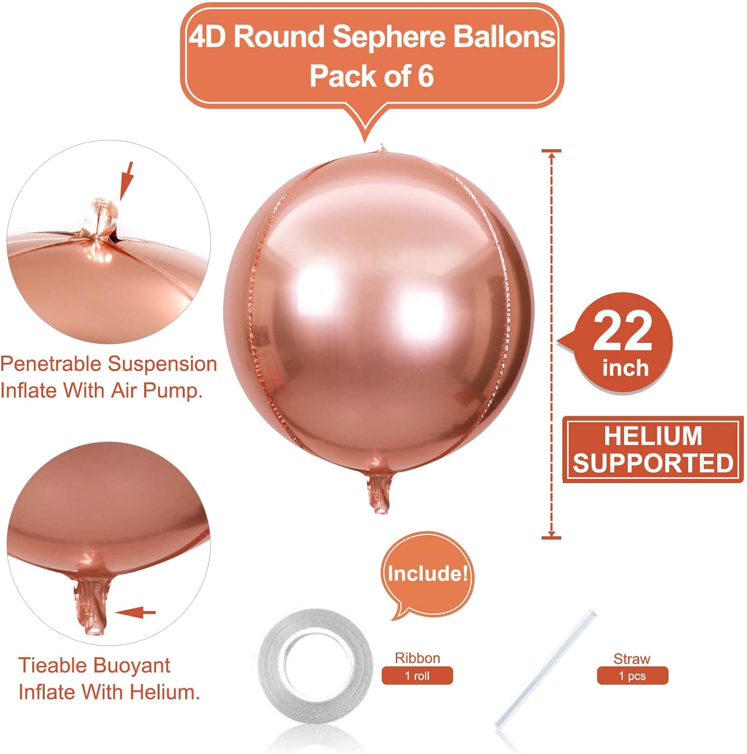 6 Pack Rose Gold 22 Inch 4D Foil Balloons Big 360 Degree Round Sephere Mylar Balloons Mirror Finish Metallic Balloons for Wedding,Birthday,Bachelorette,Baby Shower Decorations Party Supplies
