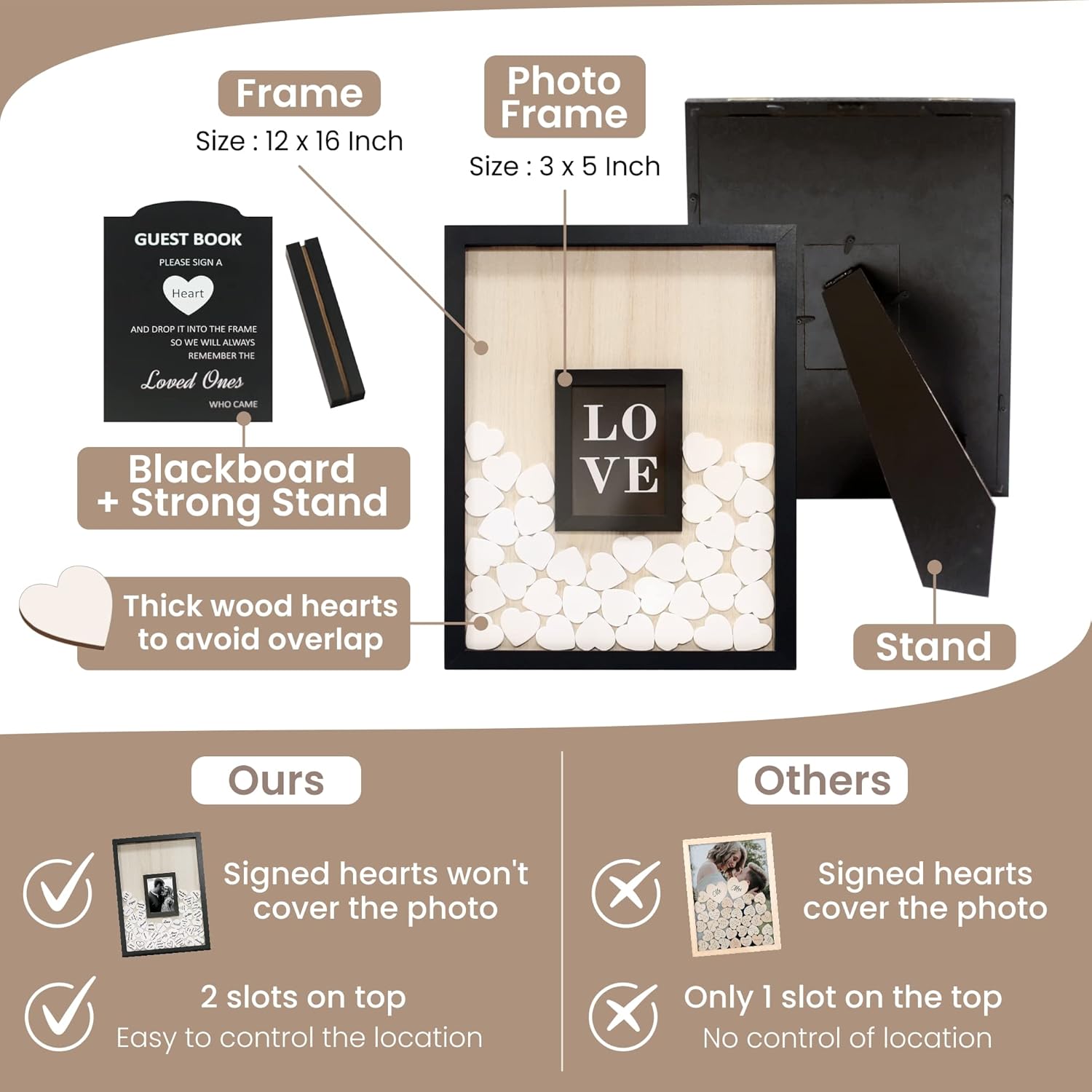 - Thoughtfully Designed: The wedding and baby shower guest book alternative are designed with a 3" x 5" photo frame in the center that can accommodate up to a 12" x 16"-inch picture. Itβs designed with not one, but 2 slots on top so guests can easily slide the hearts inside and control which side. Thicker wooden hearts and plexiglass frame to avoid overlapping of hearts that you will find from other brands.