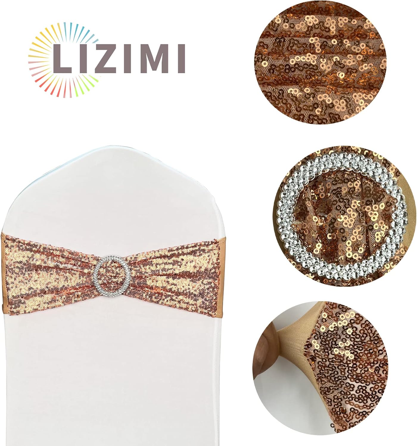 100 Pcs Chair Sashes Sequin Stretch Chair Bands Spandex Polyester Bows for Party Hotel Wedding Banquets Decoration - Rose Gold