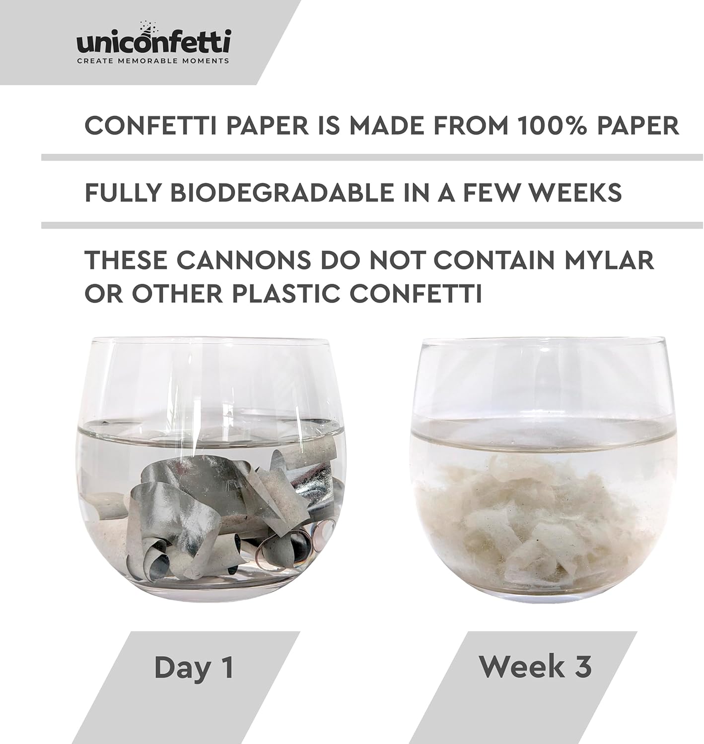- π EASY POINT & TWIST ACTION - Don't need the strongest arms to blow up these babies! Point upwards away from people and twist to shoot, Biodegradable Silver confetti paper is loaded on top of compressed air and is launched by twisting the cannon. Operation manual is included inside the box.
