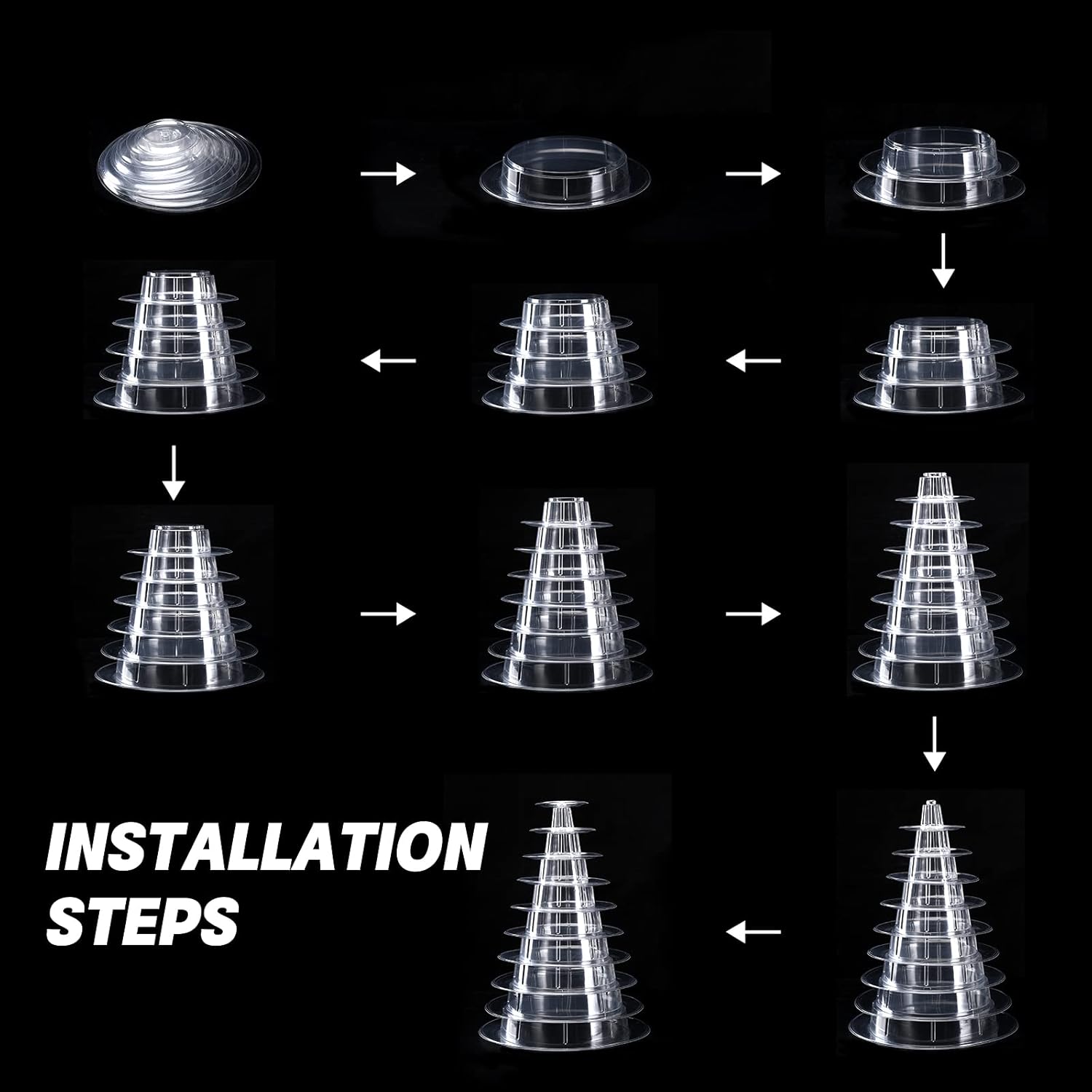 - 【10 Tiers Adjustable Tower】: The stackable cake stand can be used with just 2 or up to 10 tiers, can holds approximately 200-250 macaroons (Depending on each macaroon size). Plastic cake display stand can also show your cupcakes, desserts, cookies, donuts, fruits to your friends or families.