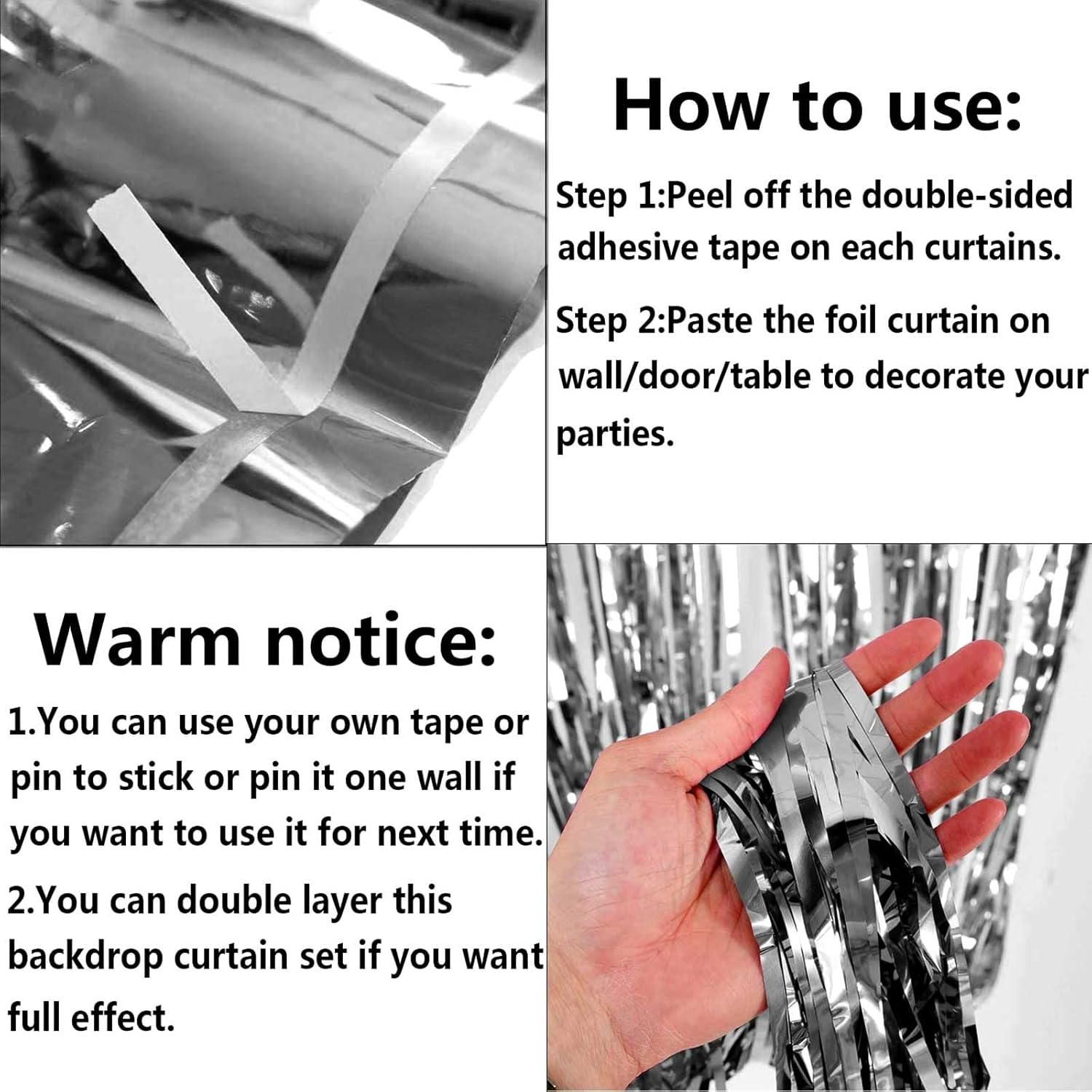 - The size of each metallic tinsel foil fringe curtain is 3.2 feet wide and 9.84 feet long, Package include 4 pack foil fringe curtains, suitable for hanging on a door or coverage a wall fully.