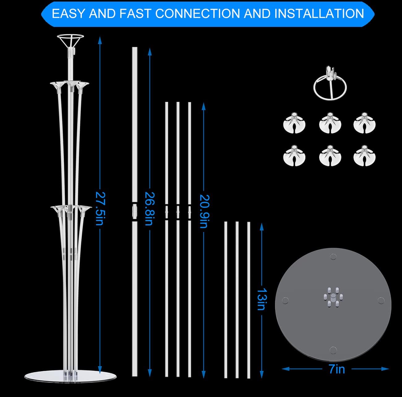 - Balloon Stand Size - Base diameter: 6.9 inches. Sticks: 1 x 28 inches long, 3 x 23.5inches long, 3 x 15.5inches long. The pole is made of durable transparent plastic and the base is made of acrylic. Can be reused.