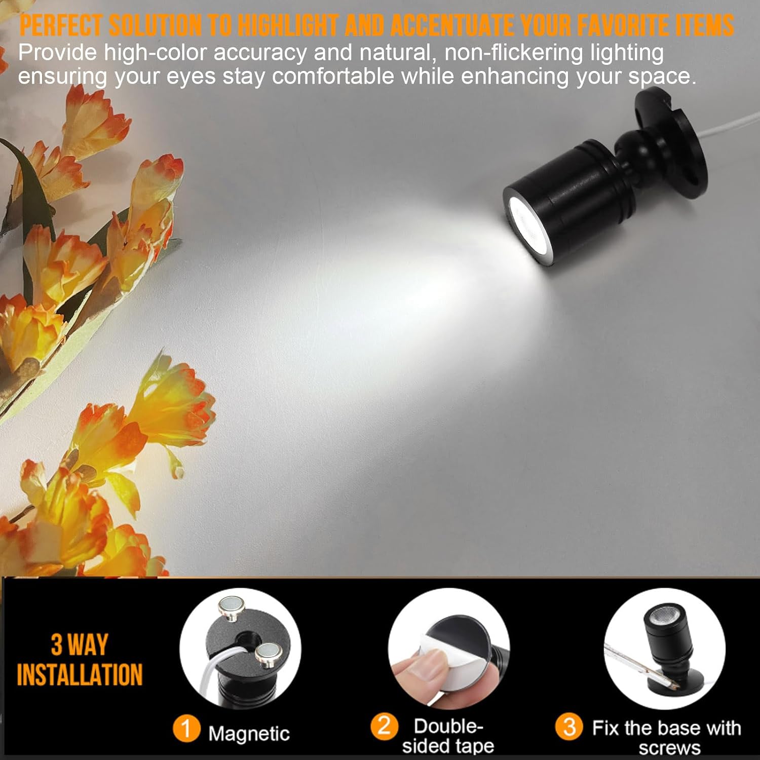 - 【Effortless Installation】Experience hassle-free installation with our mini spotlight kit. Included in the package are adhesive metal plates, magnets, double-sided tape, and screws, giving you multiple installation options. You can place these tiny lights anywhere you desire, making it a simple plug and play process.