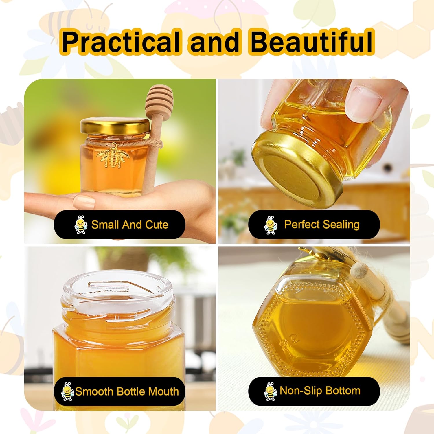 - Great Value Mini Honey Jars Set: This set includes 48 hexagon mini honey jars with dippers, lids, bee charms, gift bags, tags, and 25m of jute twine. Everything you need to craft thoughtful party favors or sweet handmade gifts with ease.