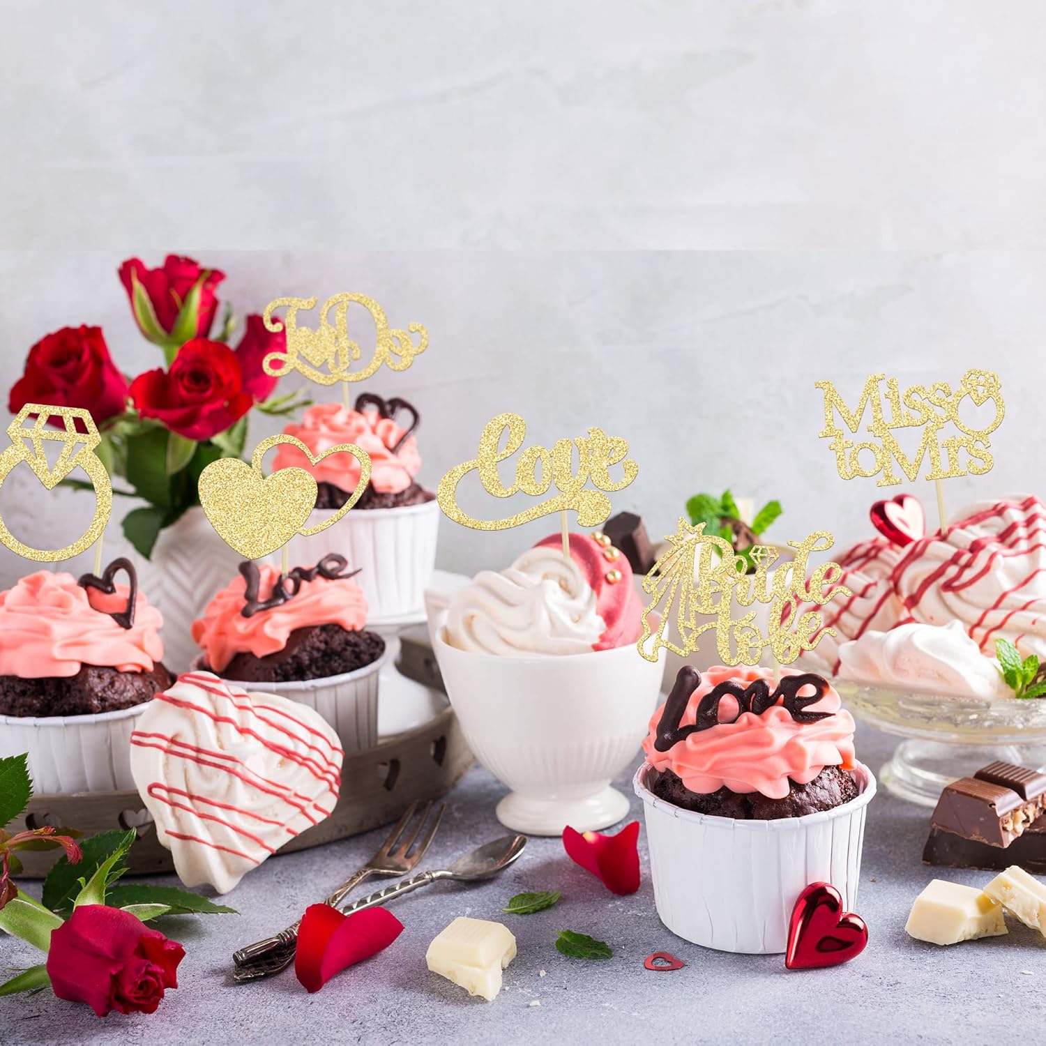 Gyufise 24Pcs Bride to Be Cupcake Toppers Gold Glitter I Do Love Heart Ring Miss To Mrs Cupcake Picks Bridal Shower Cake Decorations for Wedding Engagement Bachelorette Party Supplies