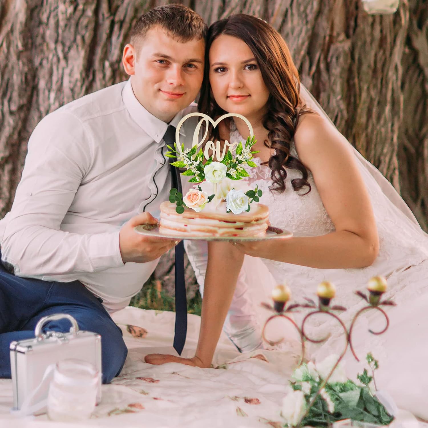 - Rustic Theme Wedding Cake Topper Set: you will get 1 piece of LOVE wooden heart shaped cake insert, 2 pieces of white artificial flowers cake toppers, 1 piece of Champagne color imitate rose flowers, and 2 pieces of eucalyptus leaves, such an exquisite combination that can satisfy your various decorative needs and add more charm to your rustic them wedding party