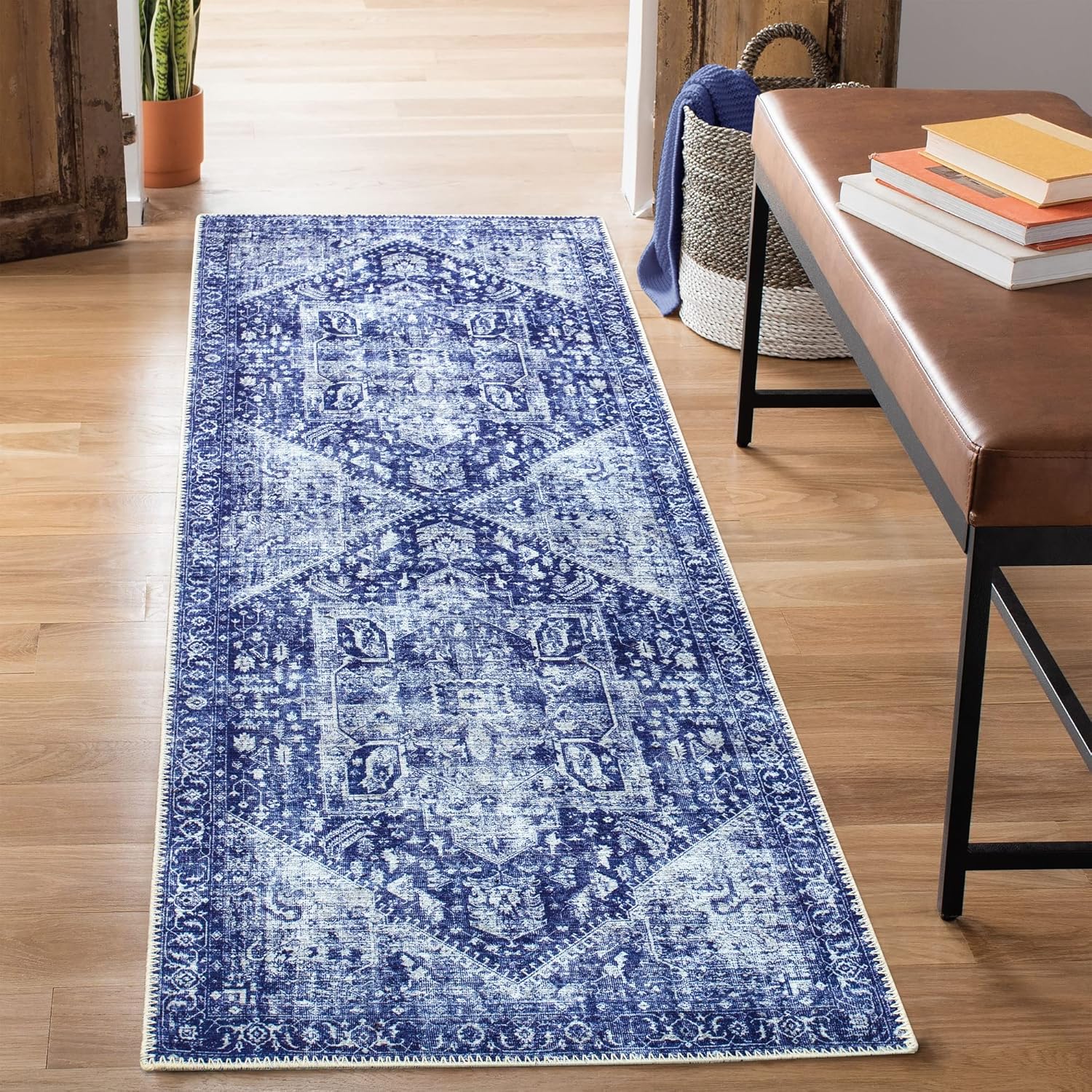 Bloom Rugs Washable Non-Slip 10 ft Runner - Blue/Ivory Traditional Runner for Entryway, Hallway, Bathroom, and Kitchen - Exact Size: 2.5' x 10'