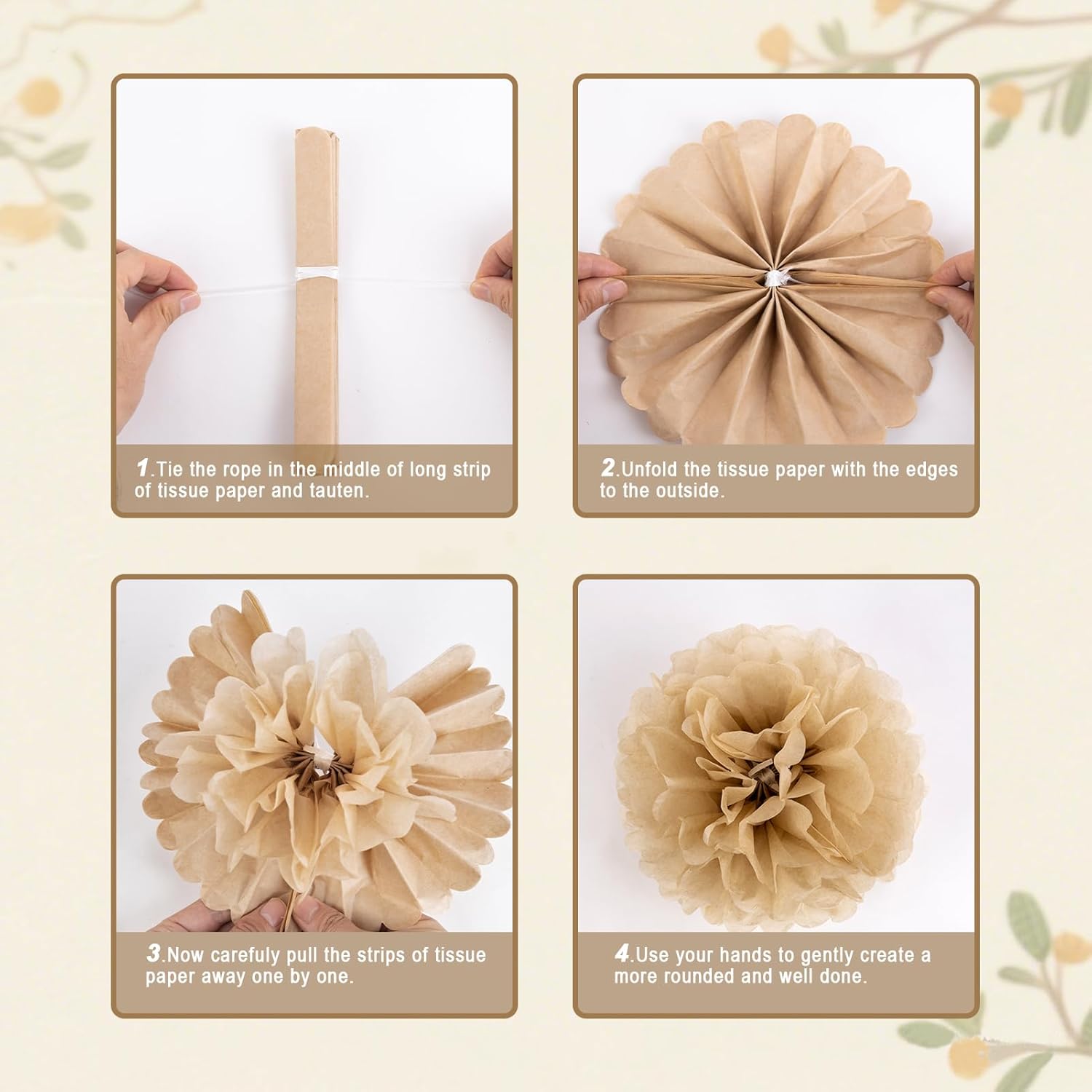 - Boho,Neutral Tones: These Tissue Paper Pom Poms in white, creamy ivory, and brown offer versatile elegance for any Neutral Party Decorations. Perfect as flower party decorations, they can be hung from ceilings, attached to walls, or used as charming centerpieces.