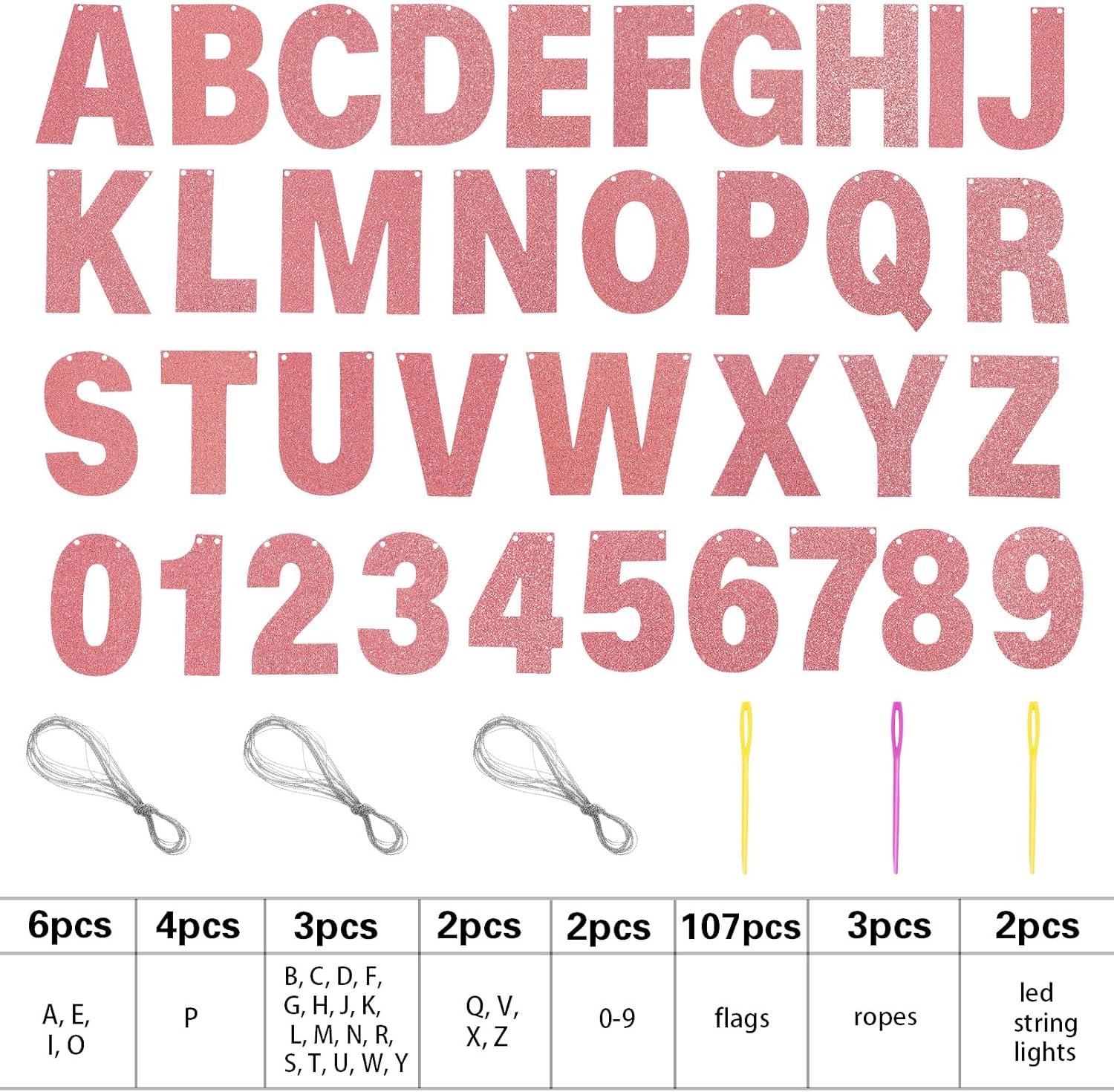 - DIY Banner Kit with Letters: you will get 107 pieces of letters and numbers, including 6 'A, E, I, O' letters, 4 'P' letters, 3 'B, C, D, G, H, J, K, L, letter M, N, R, S, T, U, letter W, Y, F shape' letters, 2 'Q, V, X, Z' letters and 2 '0-9' numbers, come with 3 ropes; Nice combination meet your various parties decorative demands