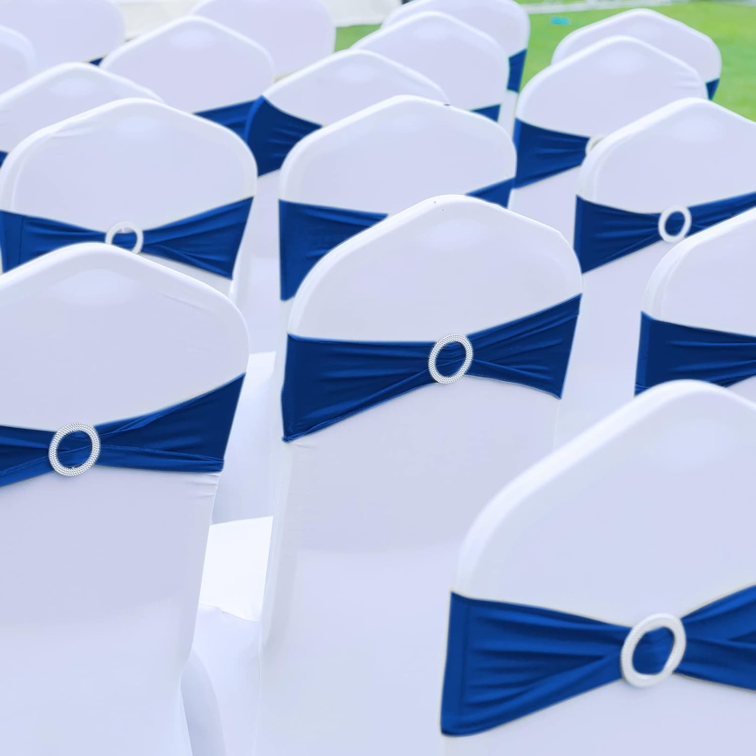 CHENGU 150 Pieces Spandex Stretch Chair Sashes Bows Elastic Chair Cover Bands Ties with Buckle Slider for Wedding Party Reception Events Universal Ceremony Banquet Decorations (Blue)