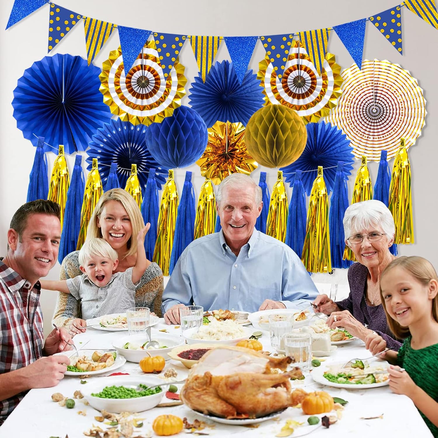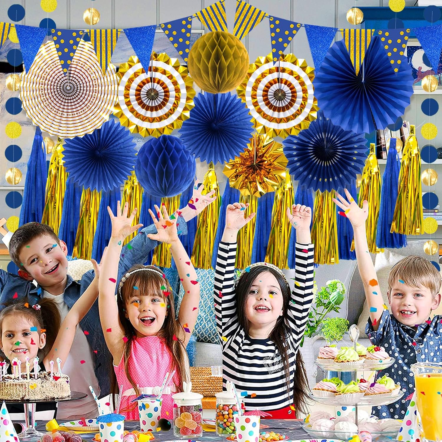 - Navy Blue Gold Party Kits: The party decorations kits include 8pcs hanging paper fans in diffrent size, 1pc 8.2ft blue gold triangle triangle flag banner, 3pcs 13.12ft circle dots paper garland, 2pcs 8inch honeycomb balls, 20pcs tassel garland. Total 34pcs.