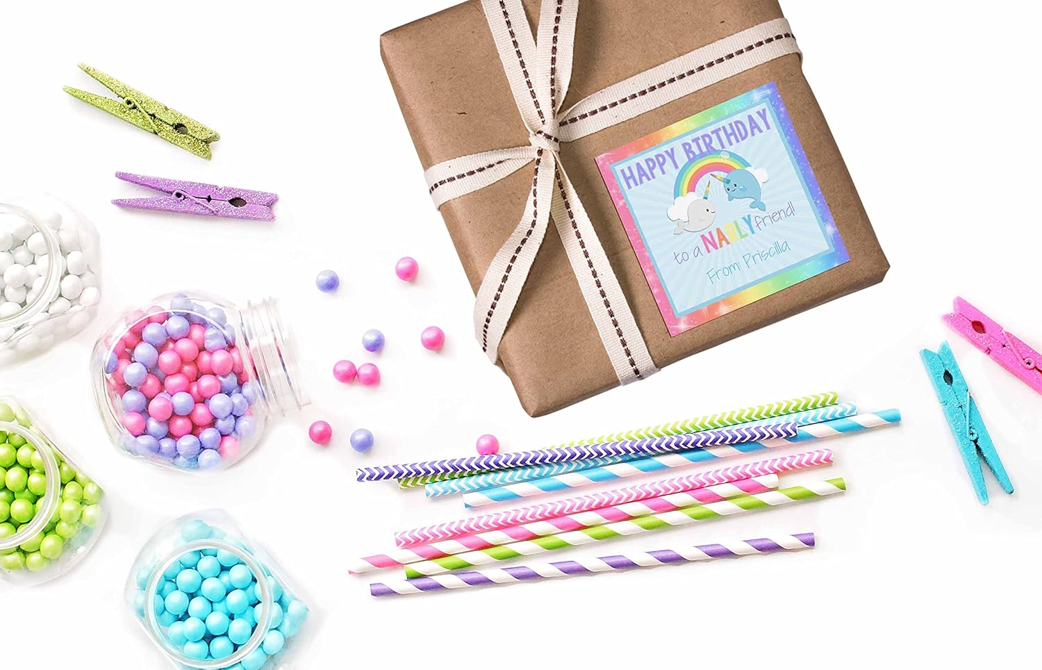 - Cuteness Overload: Designed by a talented mom, these cute stickers feature an adorable birthday narwhal design. The clever message of "NARLY" birthday wishes is the perfect way to honor the birthday boy or girl. Each sticker will be custom printed and personalized just for you! Amanda Creation. Original design by Amanda Creation.