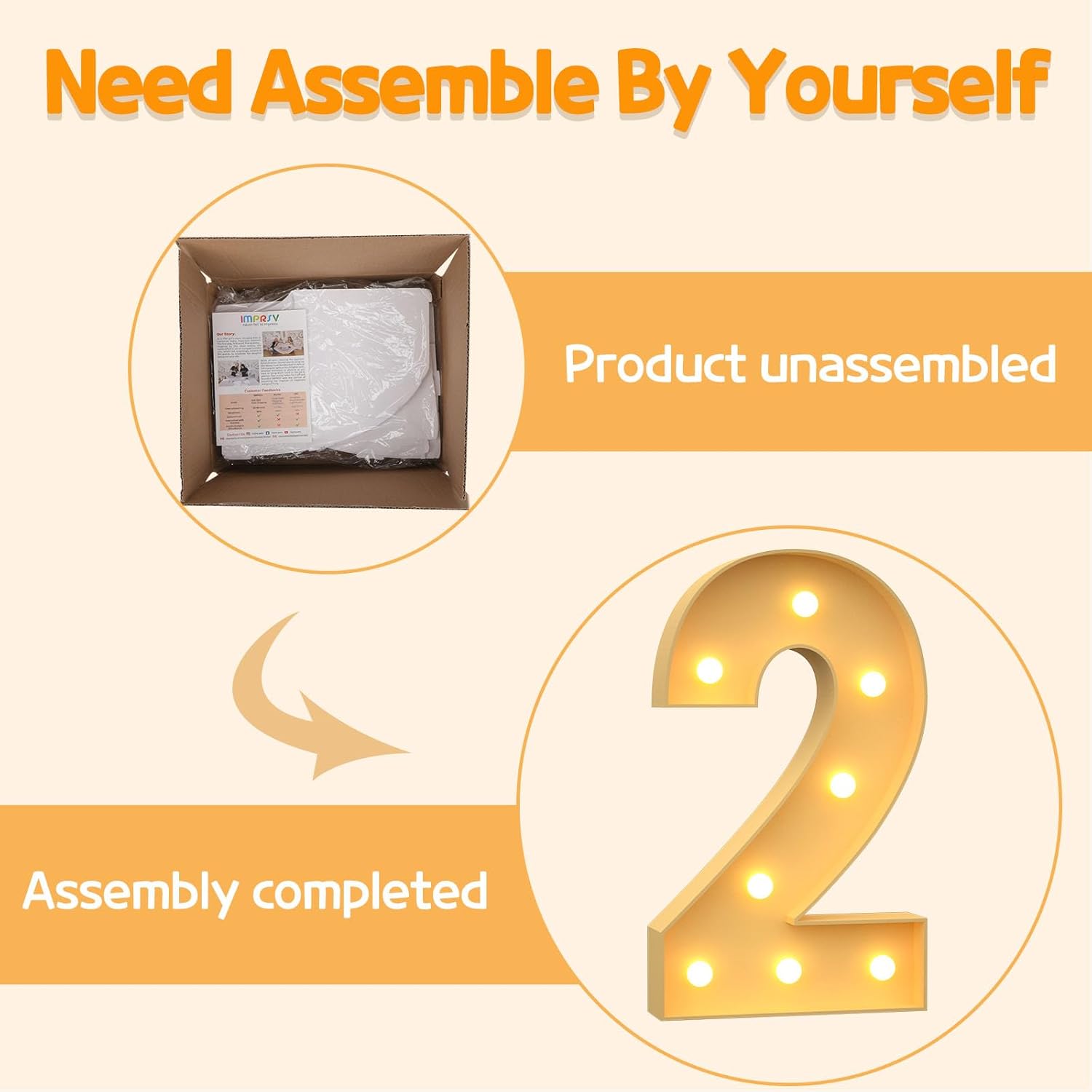 - Assembly Required: Our large marquee numbers is made from foam board and easy to assemble with our splicing mode. Just follow the numbered instructions to align and insert the bottom plate, and reinforce it with a hot glue gun. Then, you're done!