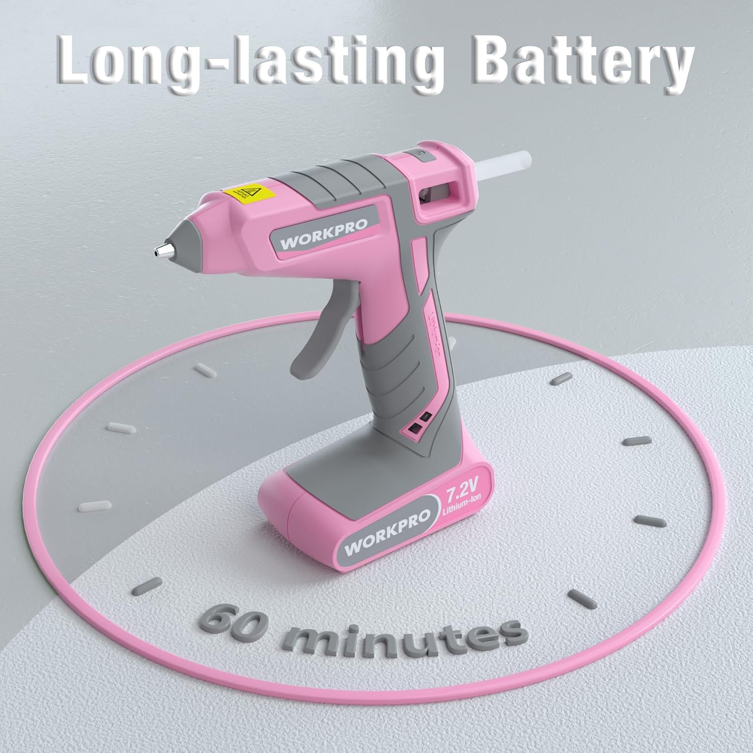 WORKPRO Pink Cordless Hot Melt Glue Gun, 7.2V Rechargeable Fast Preheating Glue Gun Kit with 20 Pc Premium Mini Glue Stick, Automatic-Power-Off Hot Glue Gun for Art, Craft, Decoration - Pink Ribbon