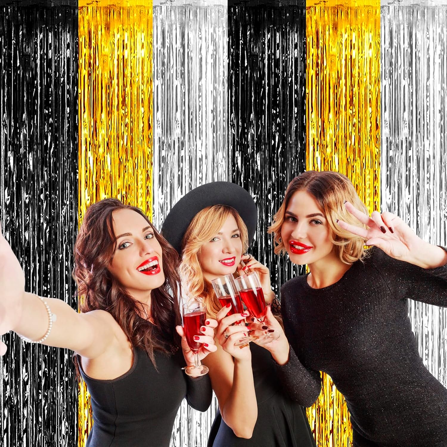 4 Pack Black Gold Silver Foil Fringe Curtain Backdrop, 3.28Ft x 9.8Ft Metallic Tinsel Foil Fringe Streamers for Photo Booth, Wedding, Notorious One Birthday Roaring 20s Graduation Party Decoration