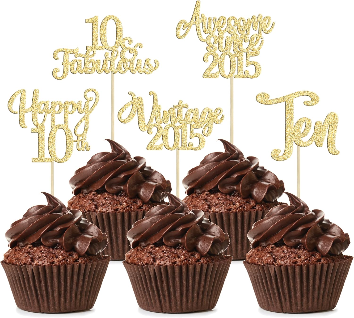 30Pcs Vintage 2015 Cupcake Toppers Glitter Happy 10th Birthday 10 Fabulous Cupcake Picks Cheers to 10 Years for 10th Birthday Wedding Anniversary Party Cake Decorations Supplies Gold