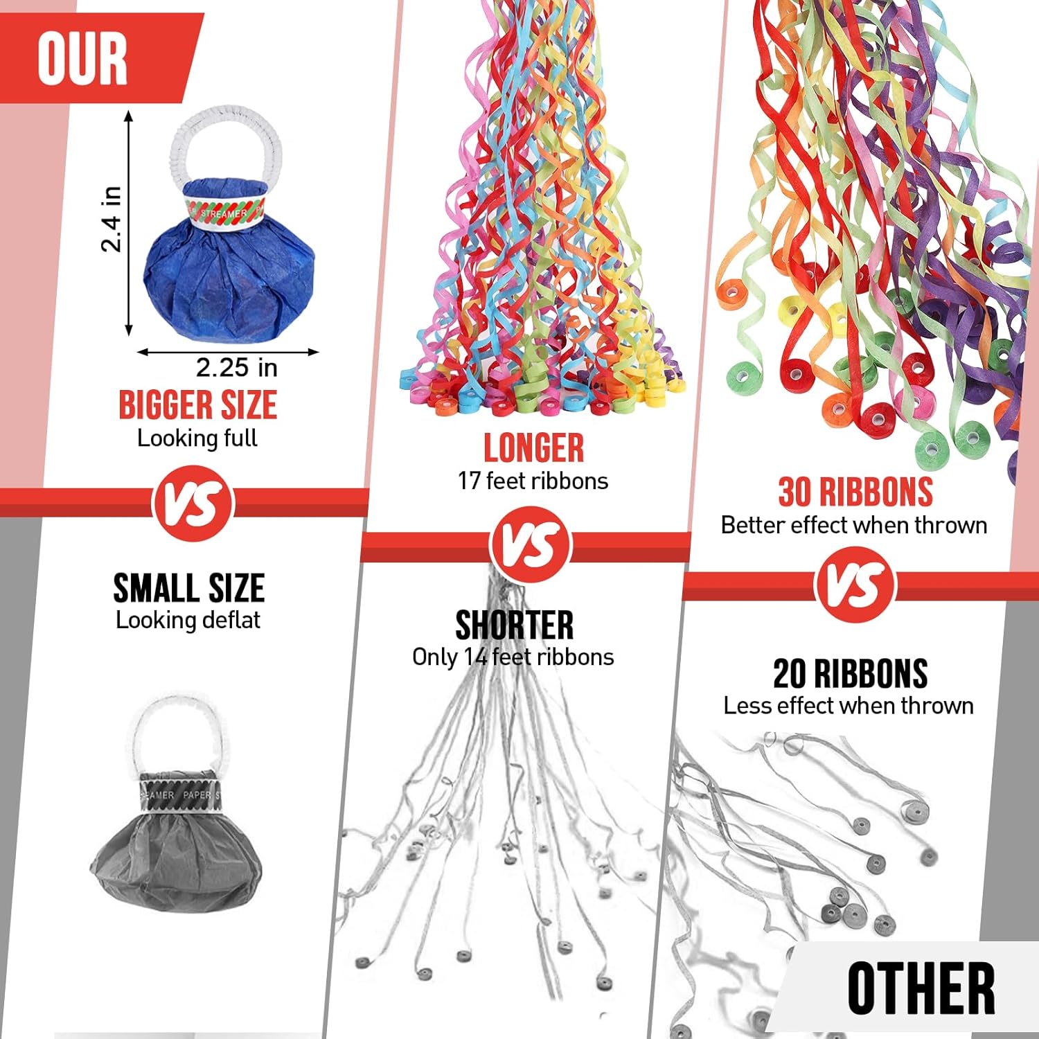 - 12 Pack/30 Ribbons/17 FT: Contains 12 Pack no each party poppers ribbons with a total of 30 thin ribbons, the length can reach 17 FT, invite guests to throw ribbons together! Add a big surprise to your party