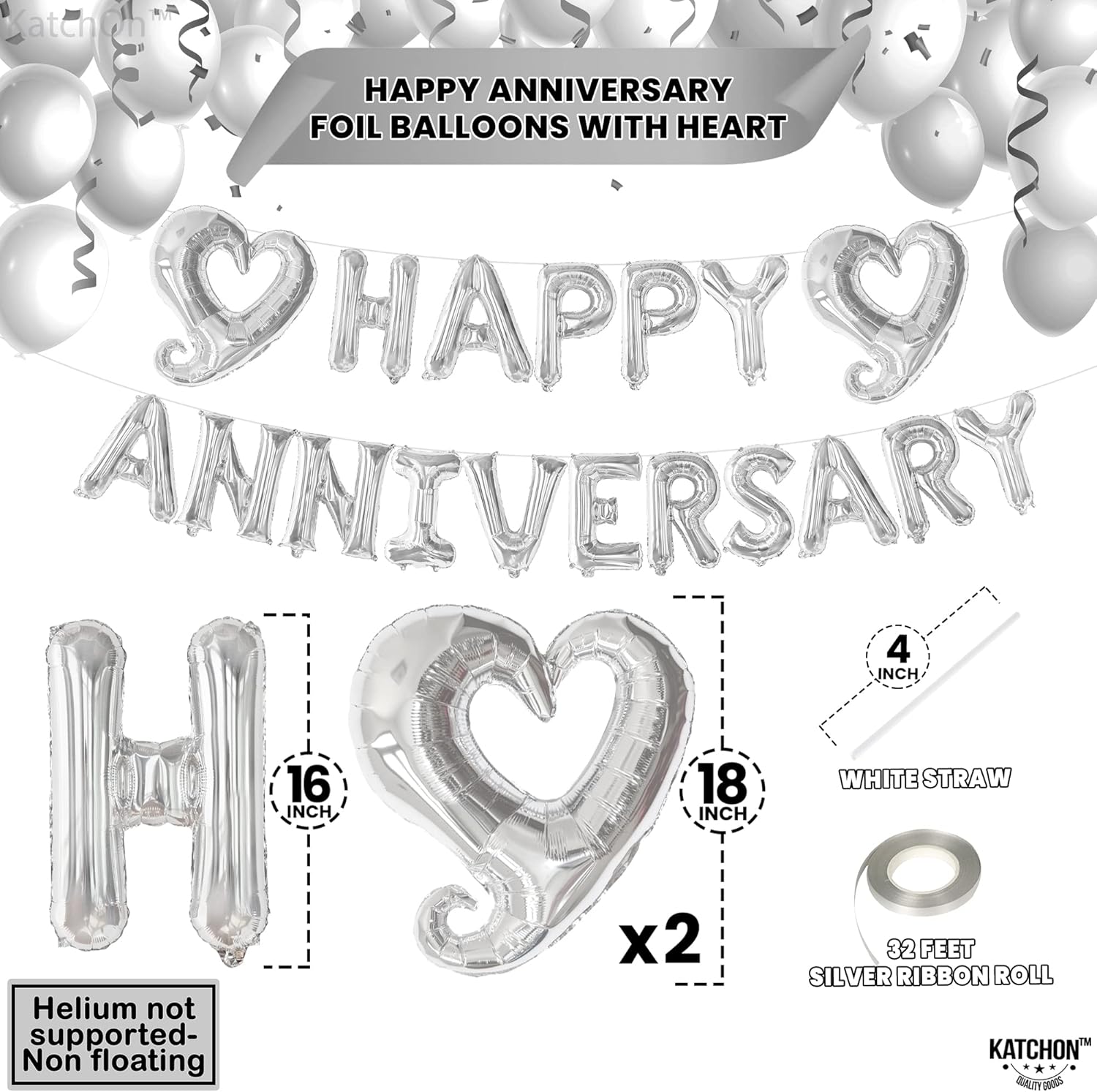 - SELF SEALING - 18 INCH | EASY TO INFLATE β This giant silver happy anniversary balloon pack that comes with a Happy anniversary silver balloon banner, 18 pieces. Designed with big 16 inchβ foil letters, 18 Inch silver heart balloons, this silver happy anniversary sign silver lets celebrate special moments with children, friends, and family. Happy wedding balloons are self sealing, holding air for long time. Add sparkle to Silver anniversary celebration with our Happy anniversary ballons.
