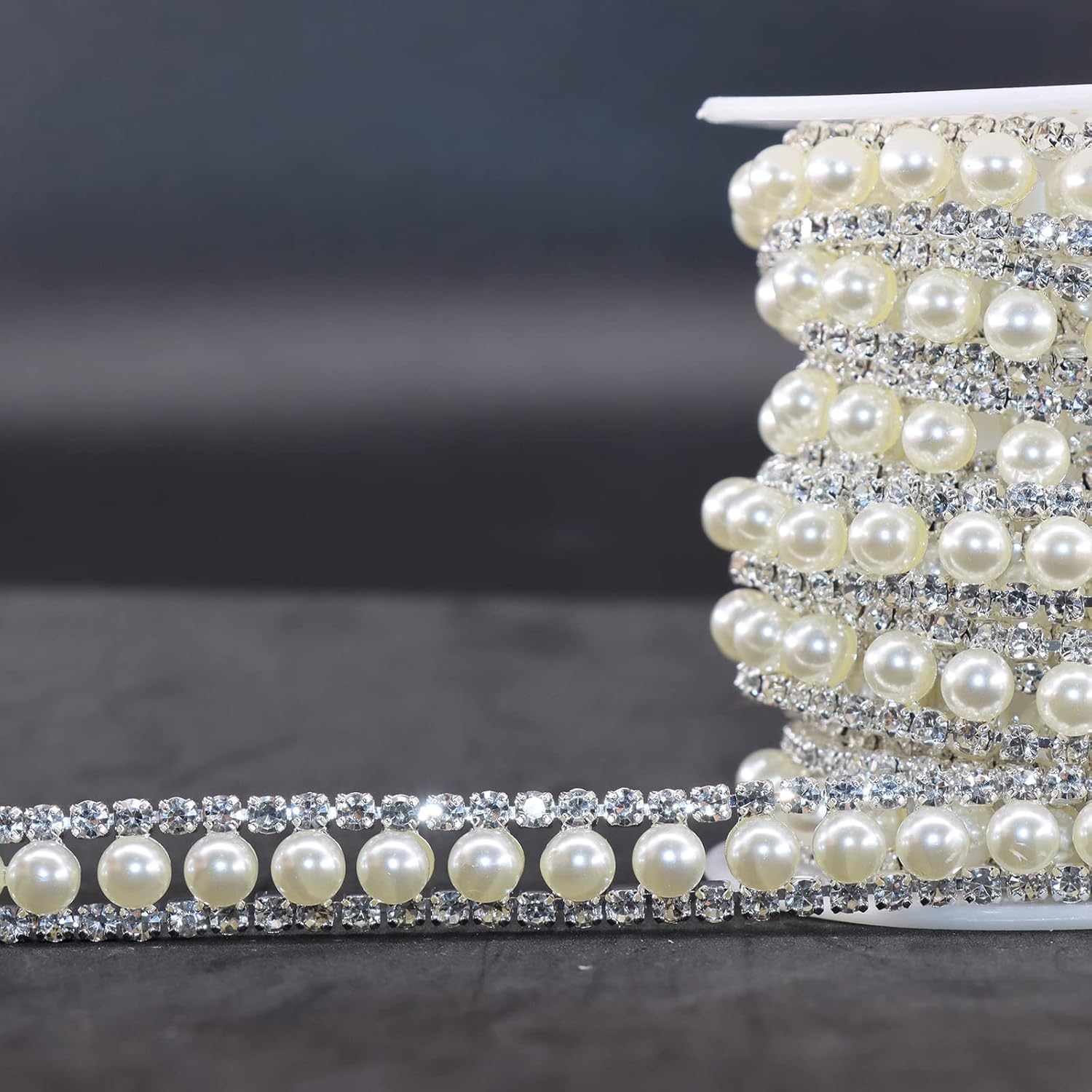 Jerler Rhinestone Trim Applique 2 Yards 2 Rows Crystal Chain Banding Diamond Inlaid White Pearl Beaded Rhinestones for Crafts Clothing and Bridal Embellishments Wedding Ideas Christmas Decorations