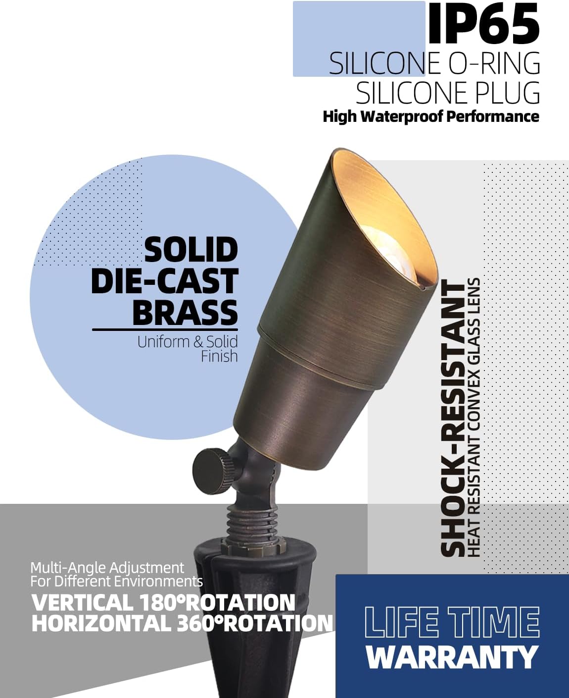 MALORY Brass Landscape Spotlight 10-Pack with Bulb(S01), Low Voltage 12V AC/DC LED Outdoor Landscape Lighting,PVC Ground Stake and Wire Connector Included, Garden Patio Trees Spot Uplight
