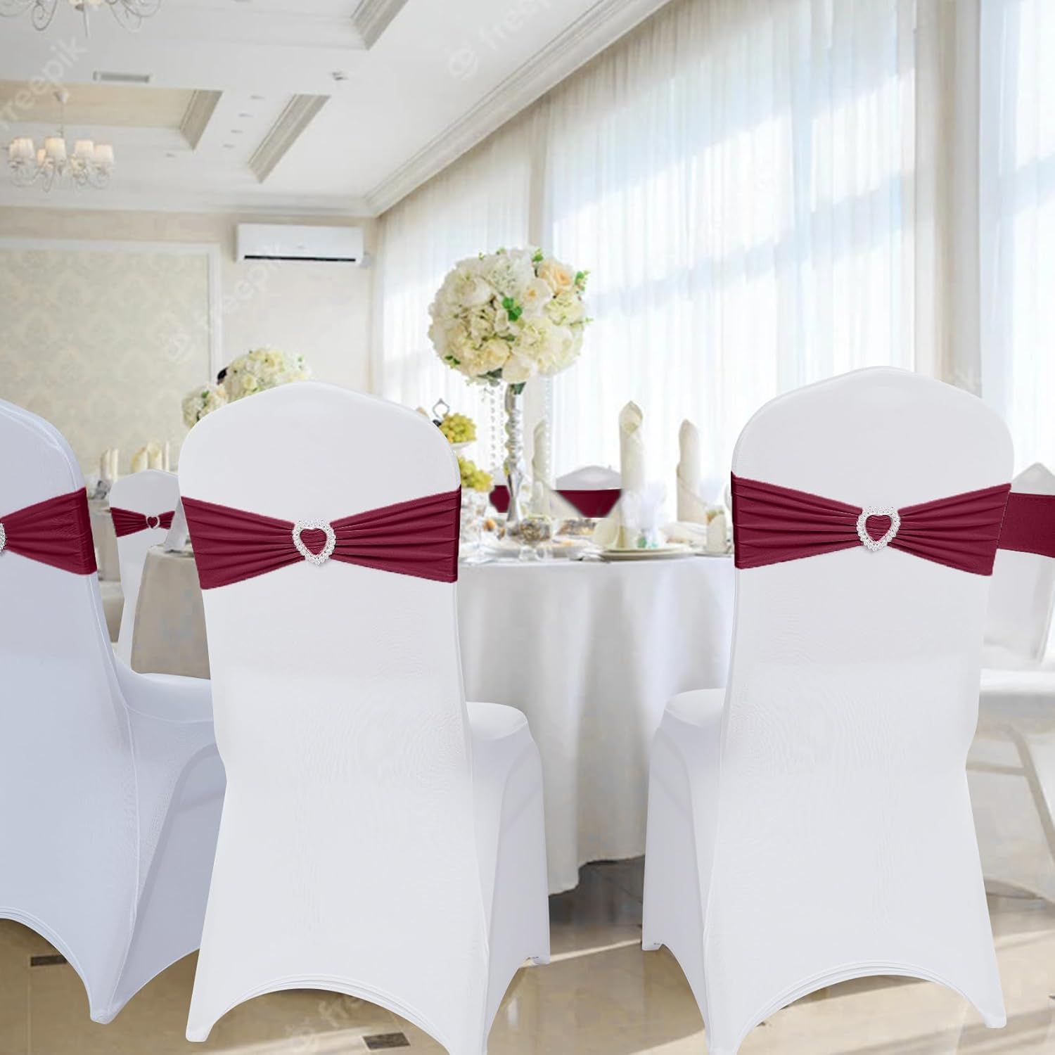 - MATERIAL:Sash(90% Polyester & 10% Spandex ), Buckle(100% Plastic).The white chair covers are not included.