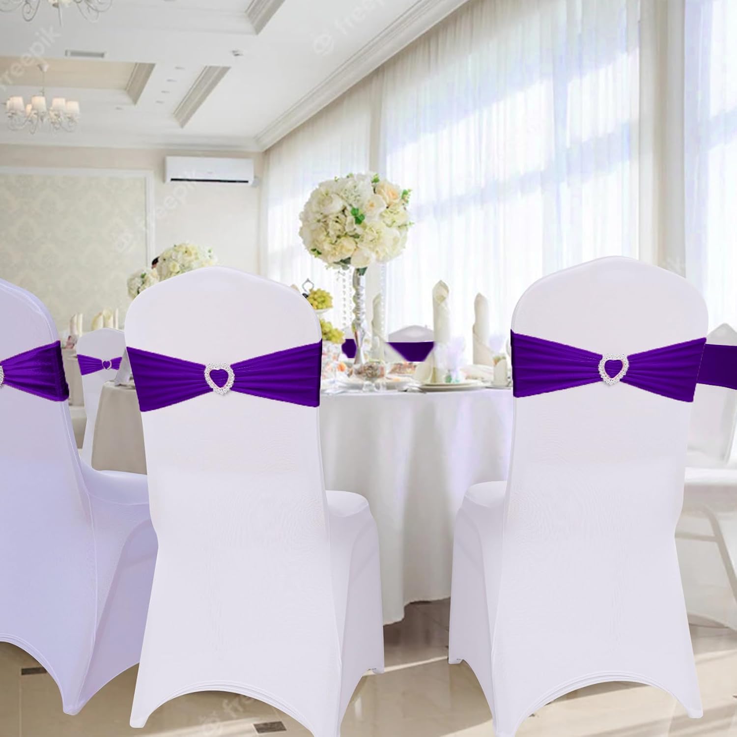 - MATERIAL:Sash(90% Polyester & 10% Spandex ), Buckle(100% Plastic).The white chair covers are not included.