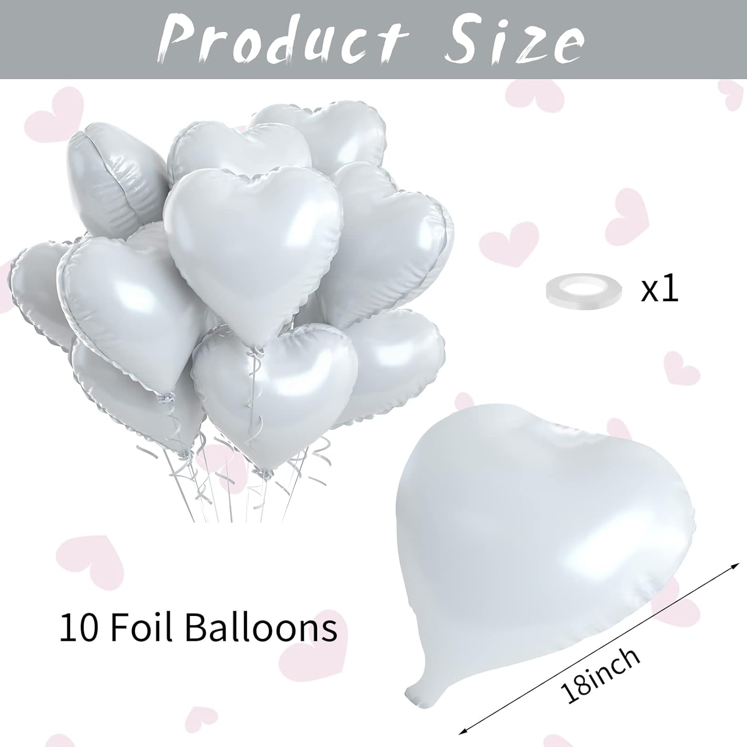 - π 10 PCS White Heart Balloons: Our package contains 10 x 18 inches white heart shaped balloons, 1 x 10m ribbon. The white foil heart balloons are specially designed to add a touch of fun and surprise to any party or holiday celebration. With a size of 18 inches, they are the perfect addition to your decorating needs, leaving your guests with an unforgettable smile!